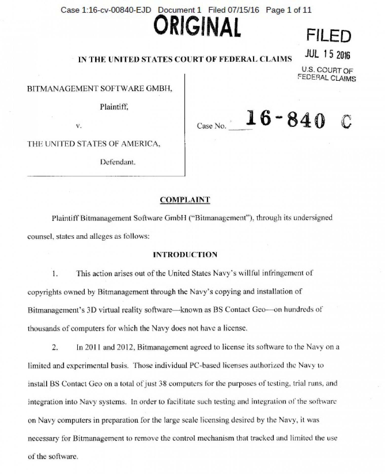 Компания по разработке программного обеспечения Bitmanagement обвинила Военно-морские силы США в пиратском использовании 3D-приложения BS Contact Geo, предъявив иск американским властям в размере $596 млн.
