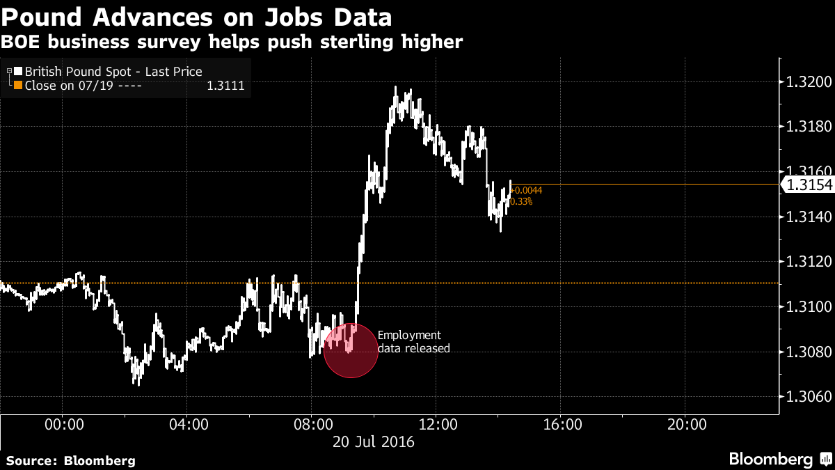 Британская валюта росла против всех 16 основных валют, когда данные показали, что уровень безработицы в Британии, измеряемый по стандартам Международной Организации Труда, снизился до 4.9% в течение трех месяцев вплоть по май. Средняя оценка по итогам опроса Bloomberg указывает на неизменный результат на уровне 5%. Отдельные данные по среднему недельному доходу неожиданно показали снижение. Фунт вырос на 0.6% до $1.3183 по состоянию на 4:03 по Лондону после снижения ранее до $1.3065 - минимума с 12 июля. Фунт укреплялся на 0.6% до 83.54 за евро.