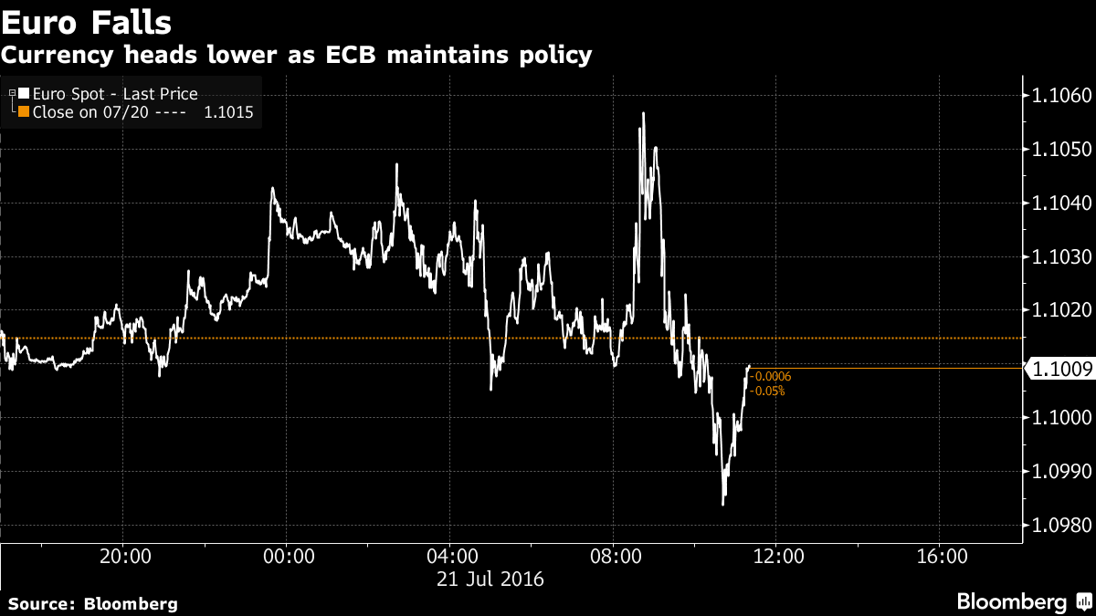 Евро демонстрировал незначительные изменения в динамике, торгуясь на уровне $1.1016 по состоянию на 14:50 в Нью-Йорке. Валюта снижалась на 0.9% до 116.64 иен. В преддверии решения в отношении политики росли спекуляции о том, что текущая программа ЕЦБ размером 80 млрд. евро ($88 млрд.) может быть доработана. Это стало возможно после референдума 23 июня, итог которого резко увеличил спрос на безопасность, толкая вниз доходность облигаций, а также снижая располагаемый запас немецких ценных бумаг для продажи.