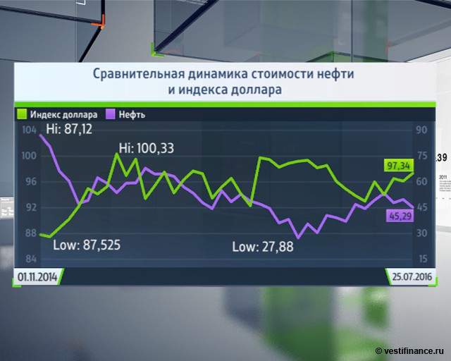 Цены на сырьевые товары отрицательно коррелируют с курсом доллара. И это связано с тем, что более сильная валюта делает привязанные к доллару сырьевые товары, такие как нефть, дороже для покупателей, использующих другие валюты.