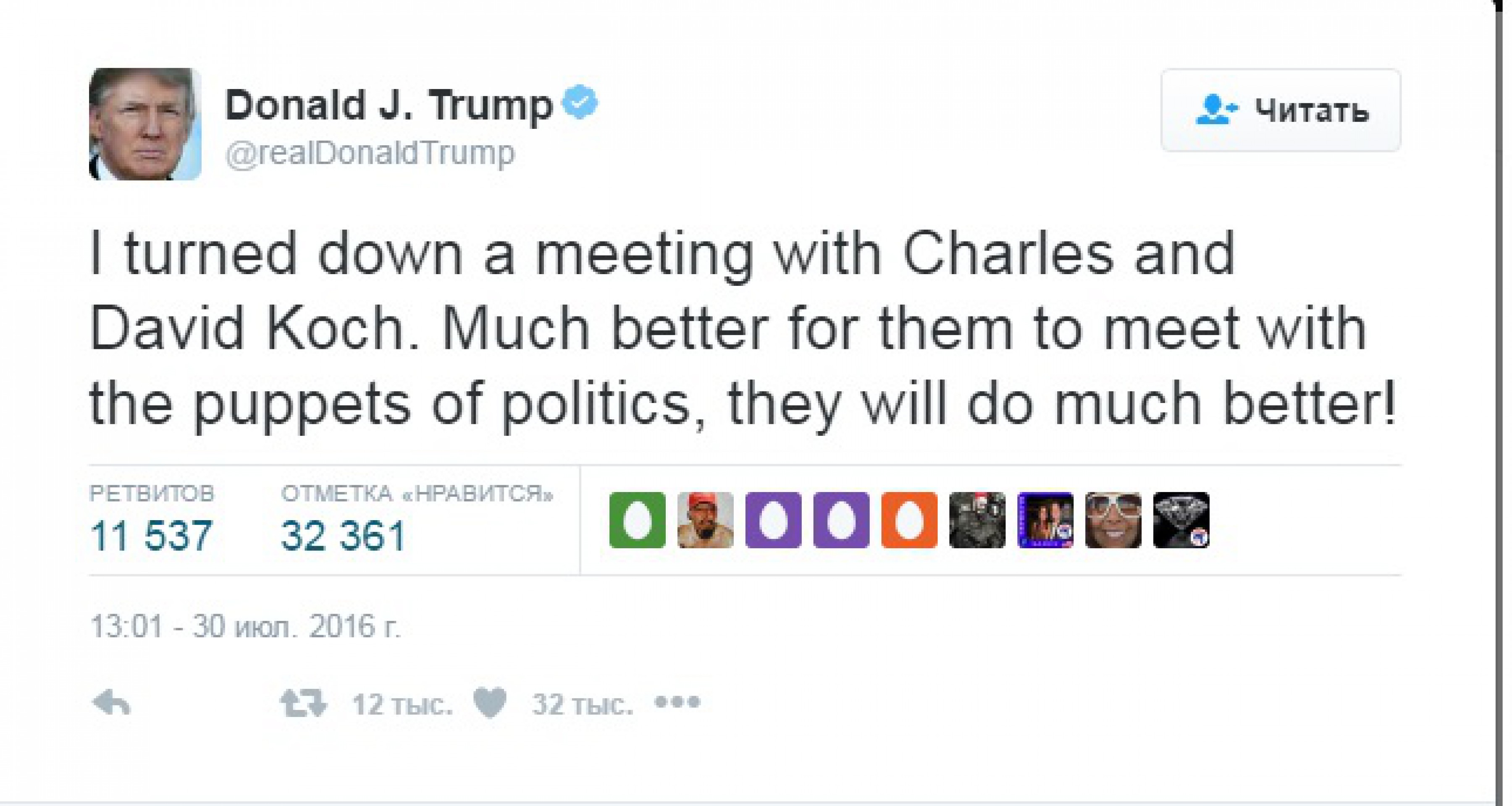 Впрочем, до конца неясно, кто кого на самом деле избегает. Авторитетное издание The Wall Street Journal написало, что Кохи просто не позвали Трампа на встречу спонсоров Республиканской партии, а уже потом Трамп написал в микроблоге, что намеренно пропустил ее.
