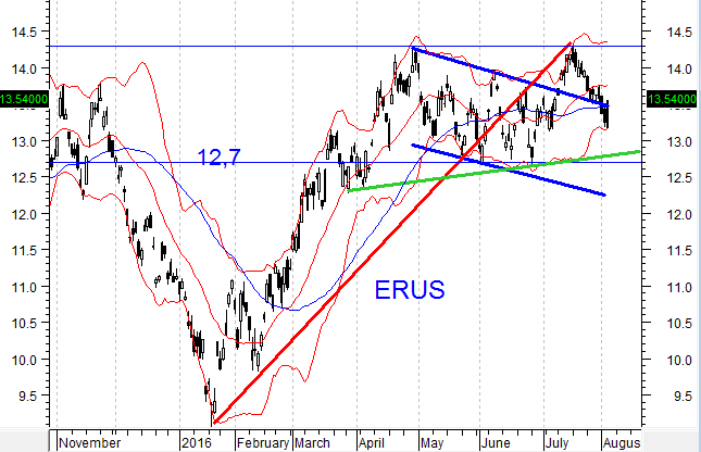 Российский индекс MSCI Russia Capped (ERUS) вырос на 2,27%. В мае восходящее движение индекса прекратилось и началось боковое движение в диапазоне 12,7 – 14,3. Те, кому некомфортно работать в условиях бокового диапазона ждут обрушения цен на нефть или наоборот пробития сопротивления 53 доллара. Но, может случиться и так, что до следующего заседания ФРС (20 сентября) характер рынка не измениться. Придется еще поскучать.