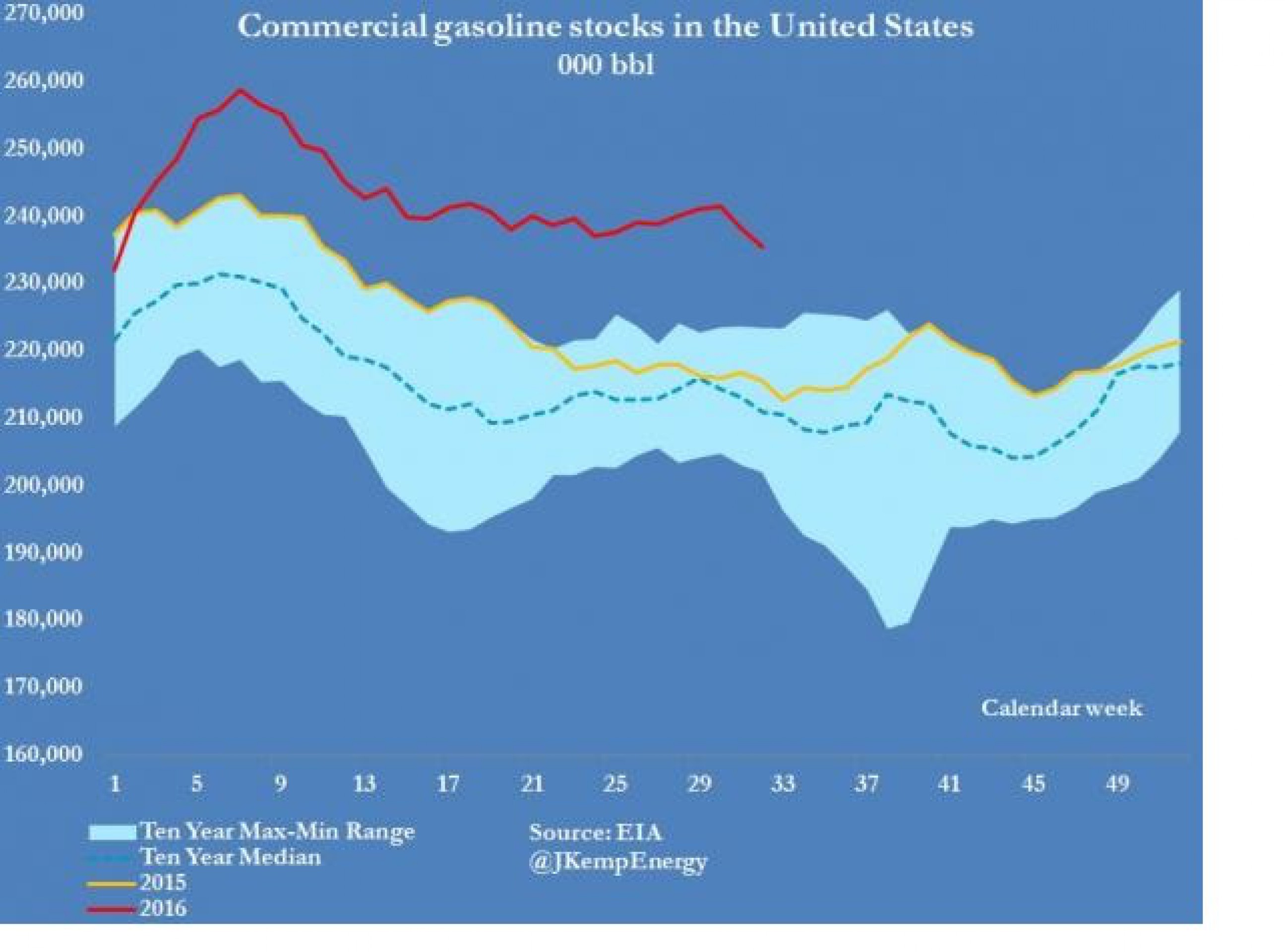 Лонгсон утверждает, что за последнее время с фундаментальной точки зрения ничего не изменилось и НПЗ только увеличивают переработку, поставляя все больше бензина на перенасыщенный рынок. Действительно, запасы бензина в стране сейчас значительно превышают среднее значение за прошлые годы.