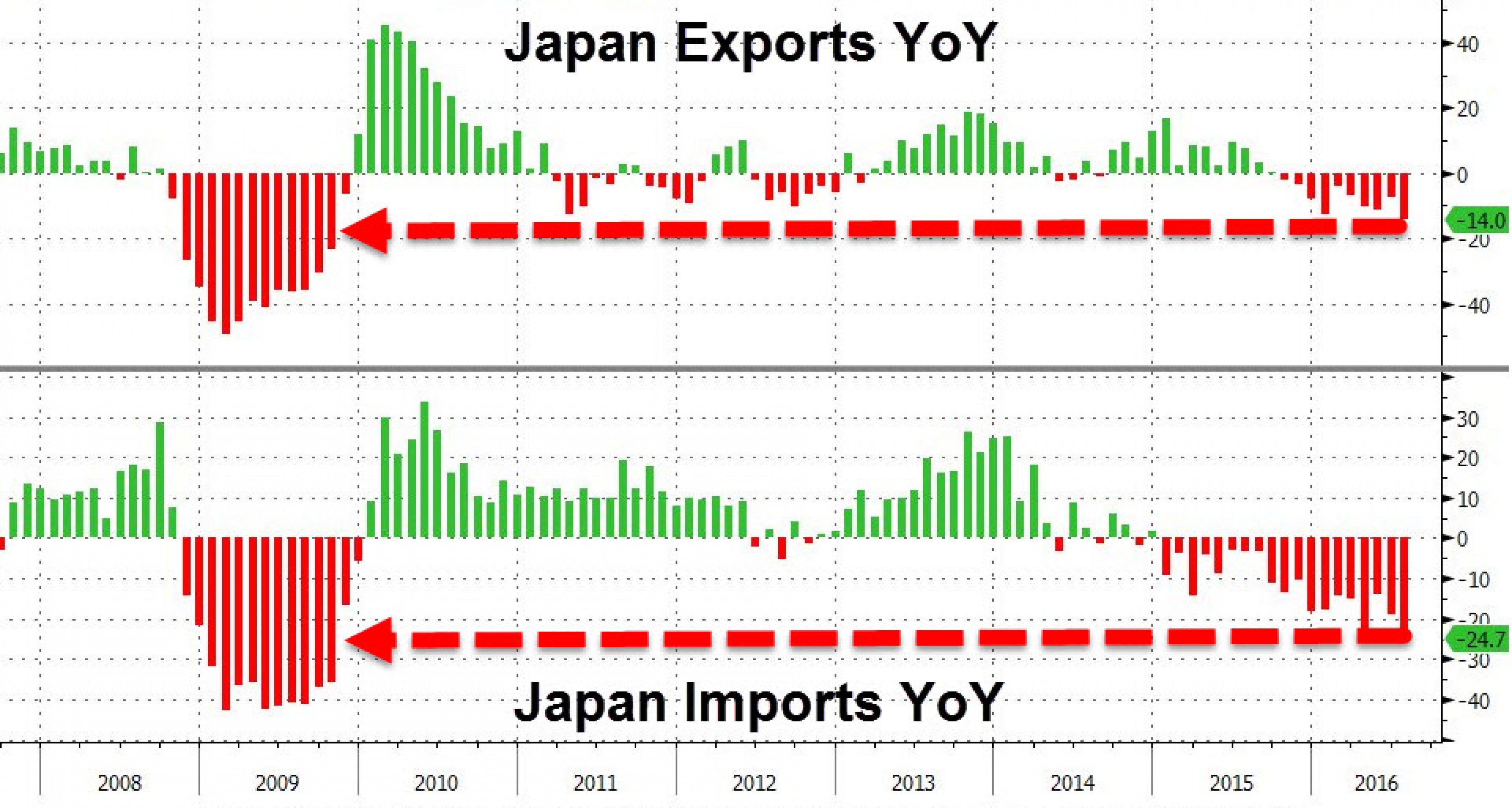 Коллапс внешней торговли Японии. Импорт страны сокращается уже 19 месяцев подряд и в июле рухнул в годовом выражении почти на 25% - это сильнейшее падение с октября 2009 г.
