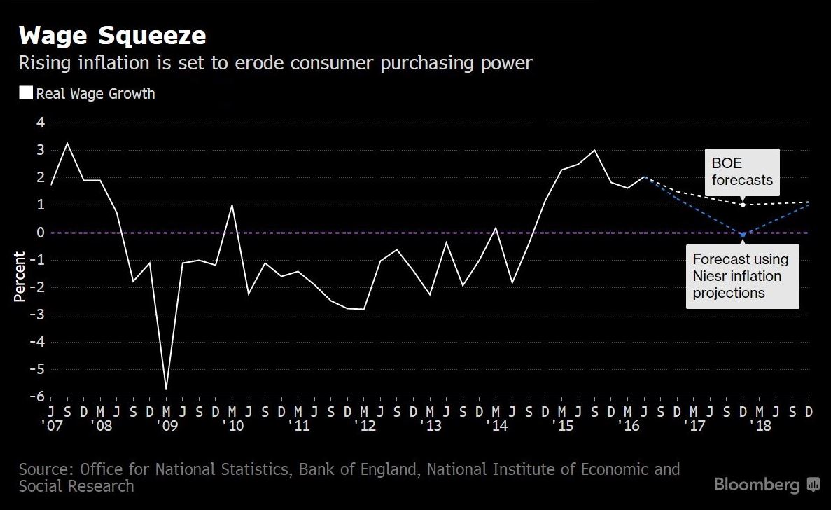 Прогнозы Банка Англии на инфляцию достигли 1.9% в следующем году, тогда как рост реальных зарплат остался на уровне около 1% в четвертом квартале 2017 с 3.2% в прошлом году. Если агрессивные прогнозы по инфляции от Государственного института экономики окажутся верными, реальные зарплаты могут показать снижение впервые с 2014 года. В то время как розничные продажи показали наилучшие значения в июле за 14 лет, официальные данные пока могут не охватывать потребительские опасения. Ведущий экономист ONS Джо Грайс предупреждает о том, что сейчас еще слишком рано оценивать последствия референдума на экономическую активность. Банк Англии сократил прогноз на рост в 2017 году всего до 0.8% с 2.3% 4 августа и прогнозировал, что уровень безработицы достигнет почти 6% к 2018 году. Чиновники снизили эталонную процентную ставку до 0.25% в августе, и большинство ожидает нового снижения, в случае ухудшения данных согласно прогнозам ЦБ.