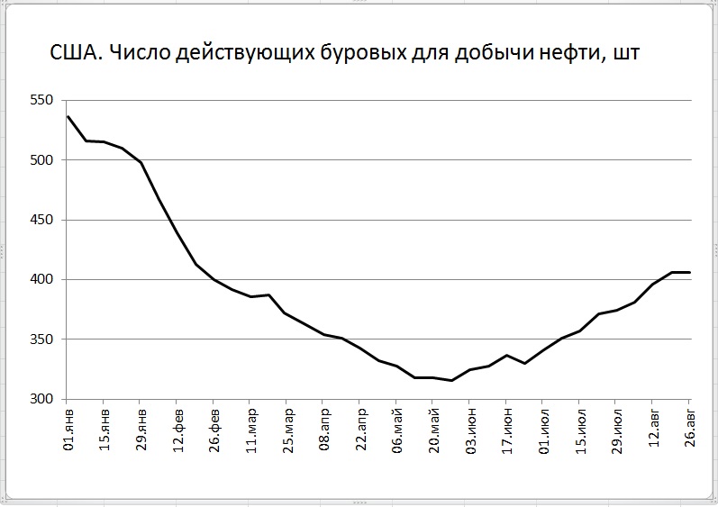 Общее число буровых в США снизилось на 2 штуки за счет вывода из работы газовых буровых. При этом количество действующих буровых на нефть осталось на прежнем уровне в 406 штук. На росшем в последние месяцы графике числа буровых на нефть появилась "полочка" заминки.