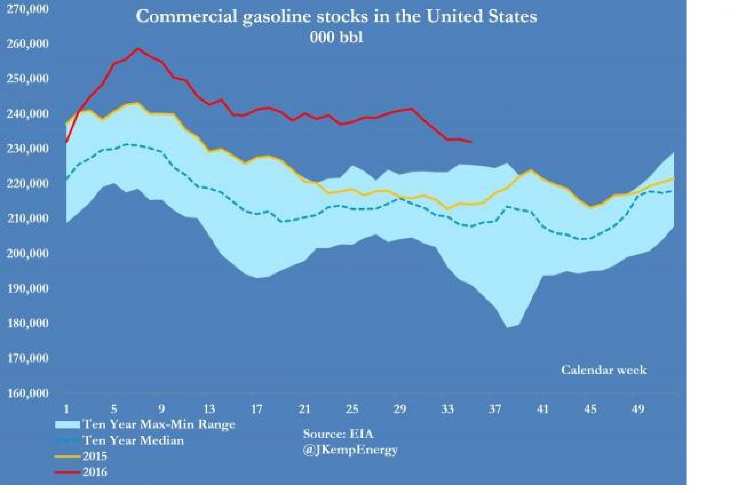 Запасы нефти в стране выросли на 2,3 млн баррелей и достигли отметки 526 млн. Почти на полтора миллиона бочек выросли запасы дистиллятов. Связано это с падением спроса со стороны НПЗ. Показатель снизился на 64 тыс. баррелей и стал минимальным с начала автомобильного сезона.