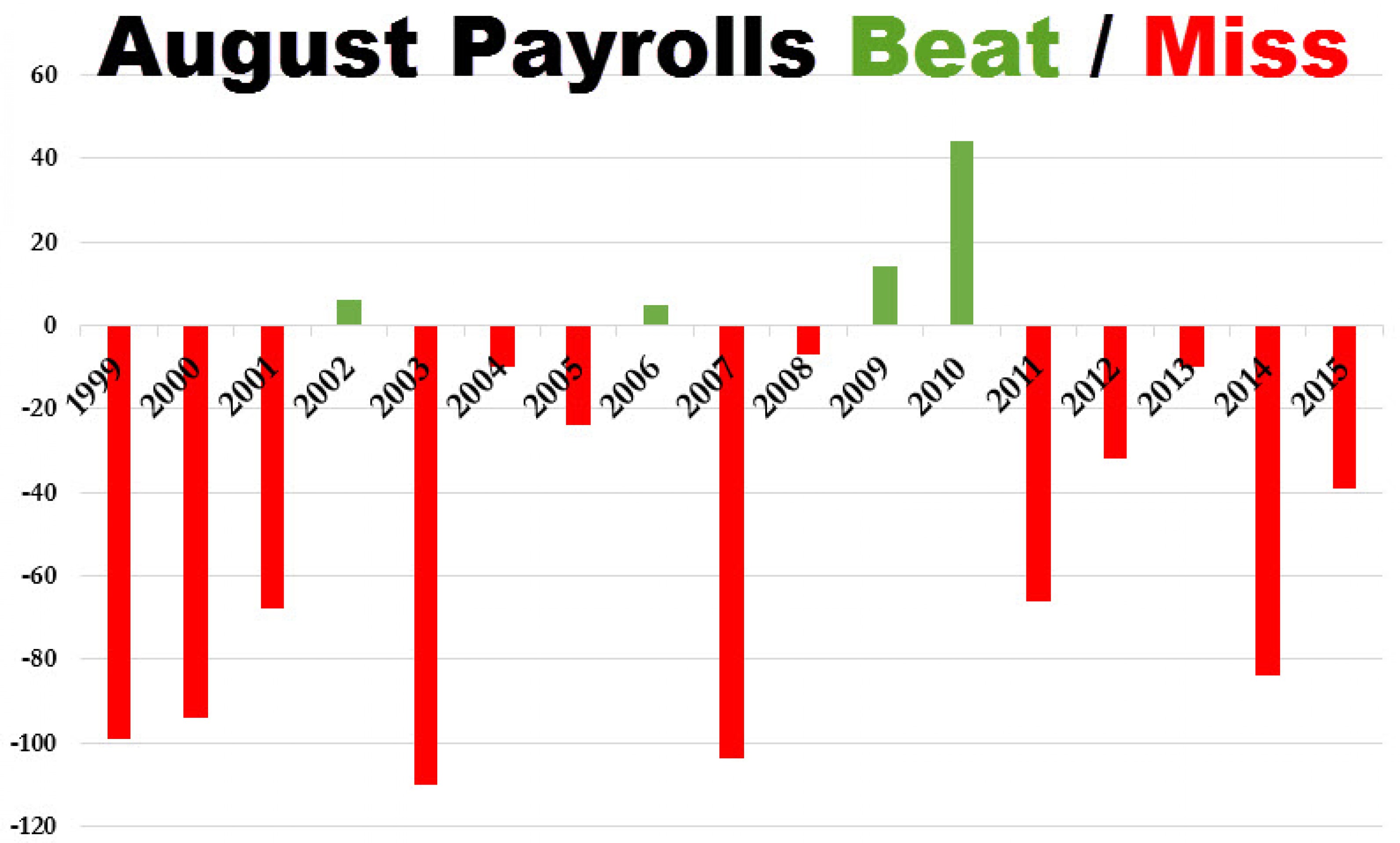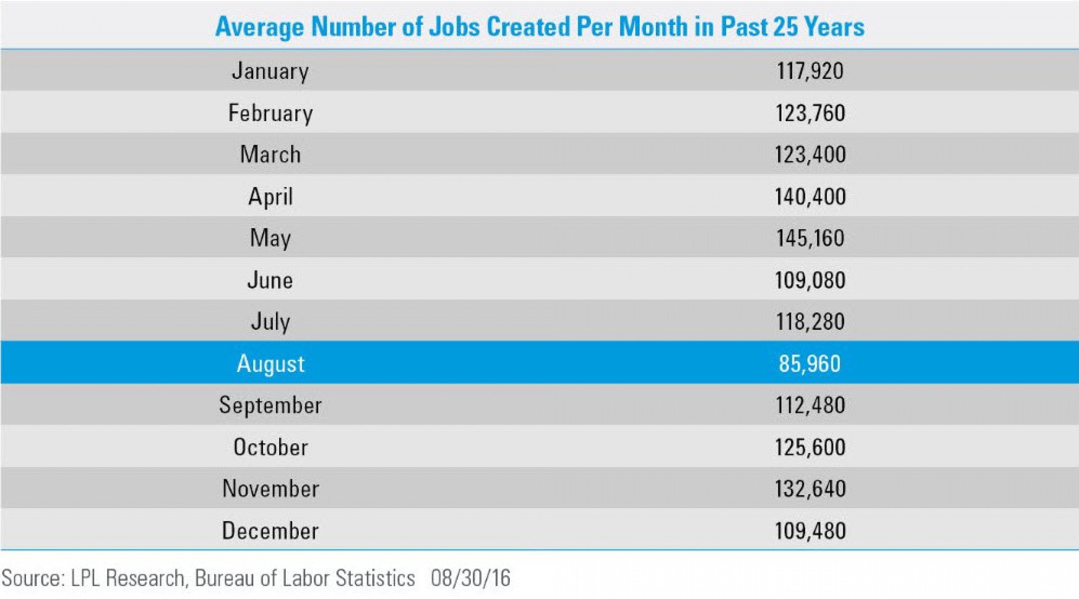 Более того, если посмотреть на доклады за последние 25 лет, август является месяцем с наименьшим количеством созданных рабочих мест. Ни один другой месяц не может конкурировать с ним по слабости этого показателя.