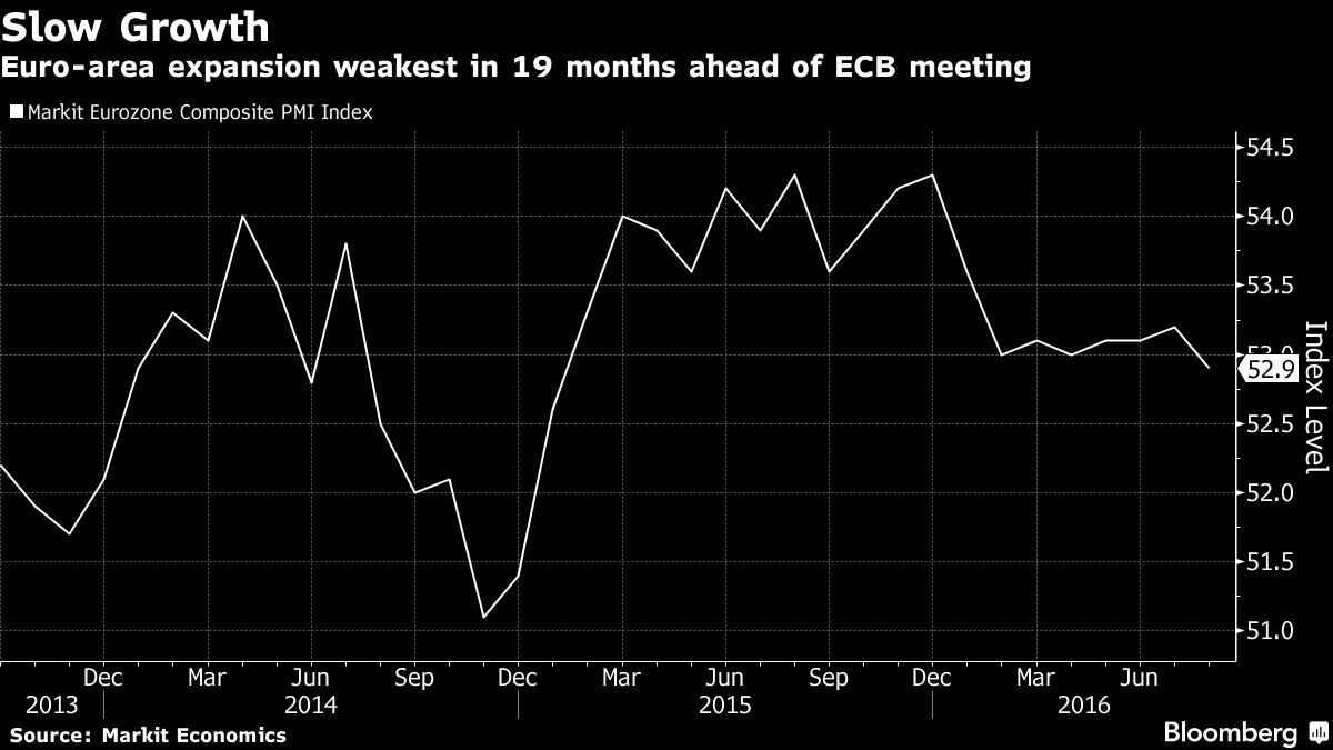 “Данные опроса будут питать прогнозы на то, что ЕЦБ может решить не медлить с инъекцией новых стимулов в экономику”, - заявил Крис Уильямсон, ведущий экономист в IHS Markit. Политики окажутся по давлением с тем, чтобы они начинали действовать позже на этой неделе, чтобы придать импульс доверию в контексте экономики и целей по инфляции. Рост новых заказов замедлился до минимума с января прошлого года, и появляются признаки охлаждения роста создания рабочих мест. Снижение в Германии, возможно, самый существенный источник проблем. Рост производства на минимуме за 15 месяцев, хотя экономика все еще обходит Францию, где рост ускорился до 10-месячного максимума. Индекс, отслеживающий ситуацию в региональном секторе услуг, снизился до 52.8 с 52.9 в июле, заявили в IHS Markit.