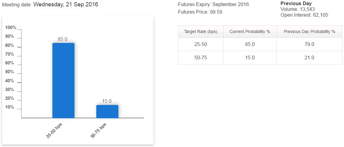 Кстати, во вторник именно с США внесли основную лепту в дневное подрастание нефтяных цен. В стране вышли неблагоприятные показатели: снижение индекса деловой активности (ISM) в непроизводственной сфере и индекса условий рынка труда ФРС. В результате вновь снизилась вероятность повышения ставки ФРС на сентябрьском заседании ФРС. Сегодня рынок оценивает смелость ФРС на сентябрьском заседании только в 15% против 21% к концу прошлой недели.