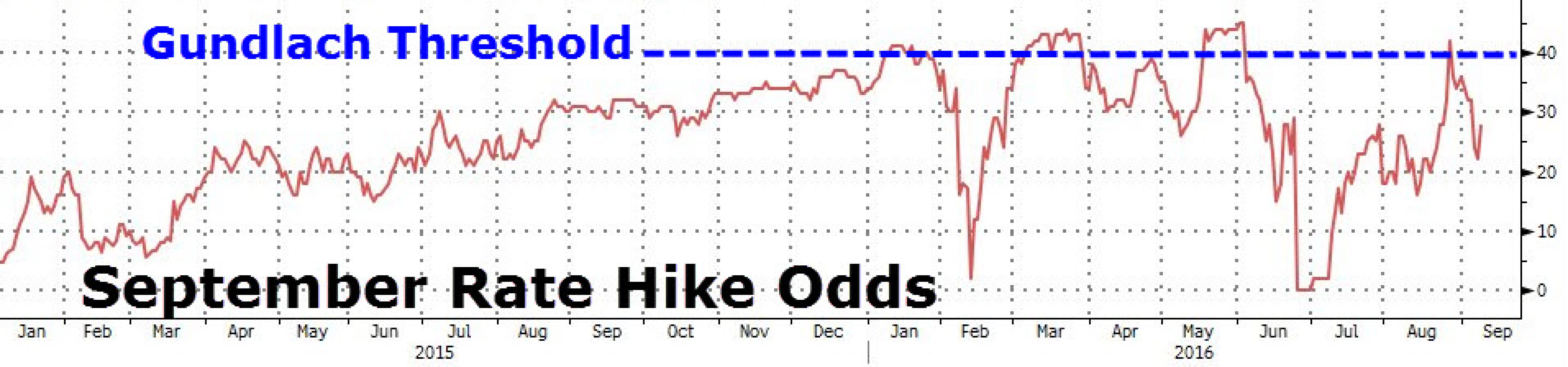 Лучшее ли время для ужесточения денежно-кредитной политики? Ответ можно искать в приведенном выше графике. Да и рынок, откровенно говоря, не верит в повышение ставки, во всяком случае на ближайшем заседании в сентябре. Вероятность повышения оценивается трейдерами менее чем в 30%.