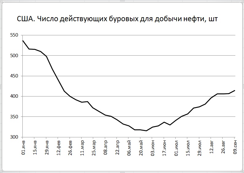 Как видим, число буровых на нефть в США подросло на 7 штук – тренд роста числа действующих буровых продолжился. На сегодняшний день число буровых на нефть выросло уже почти на треть против минимальных значений конца мая. И это уже достаточно солидный рост. Правда помним, что даже сегодняшнее увеличенное их число составляет лишь 25,7% от максимальных уровней октября 2014 года.