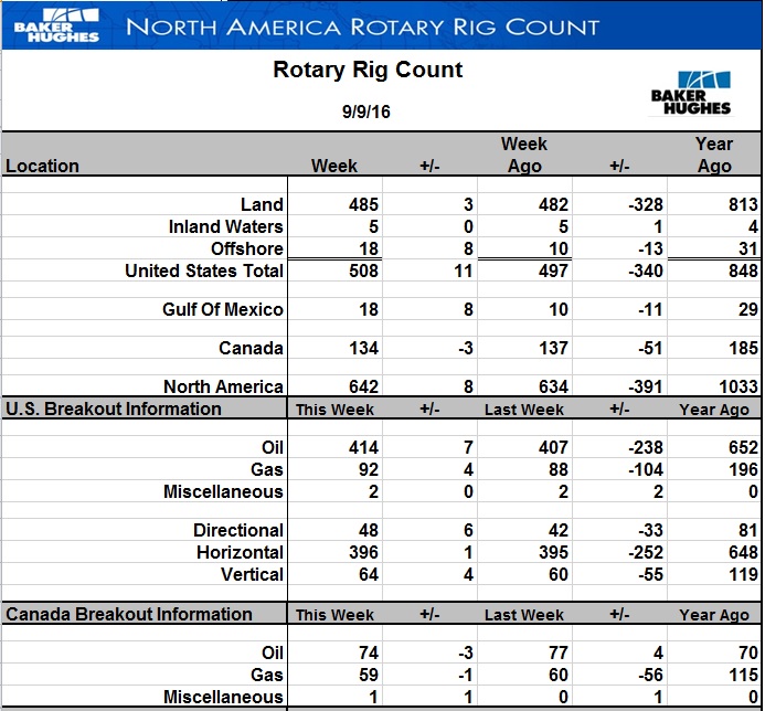 Вышла свежая порция данных от компании Baker Hughes по буровой активности на 9 сентября. Общее число буровых в США выросло на 11 шт. Интересной новостью вышедших данных стала информация о лишь минимальном снижение числа действующих буровых в августе вне США и Канады. Таблица буровой активности выглядит следующим образом: