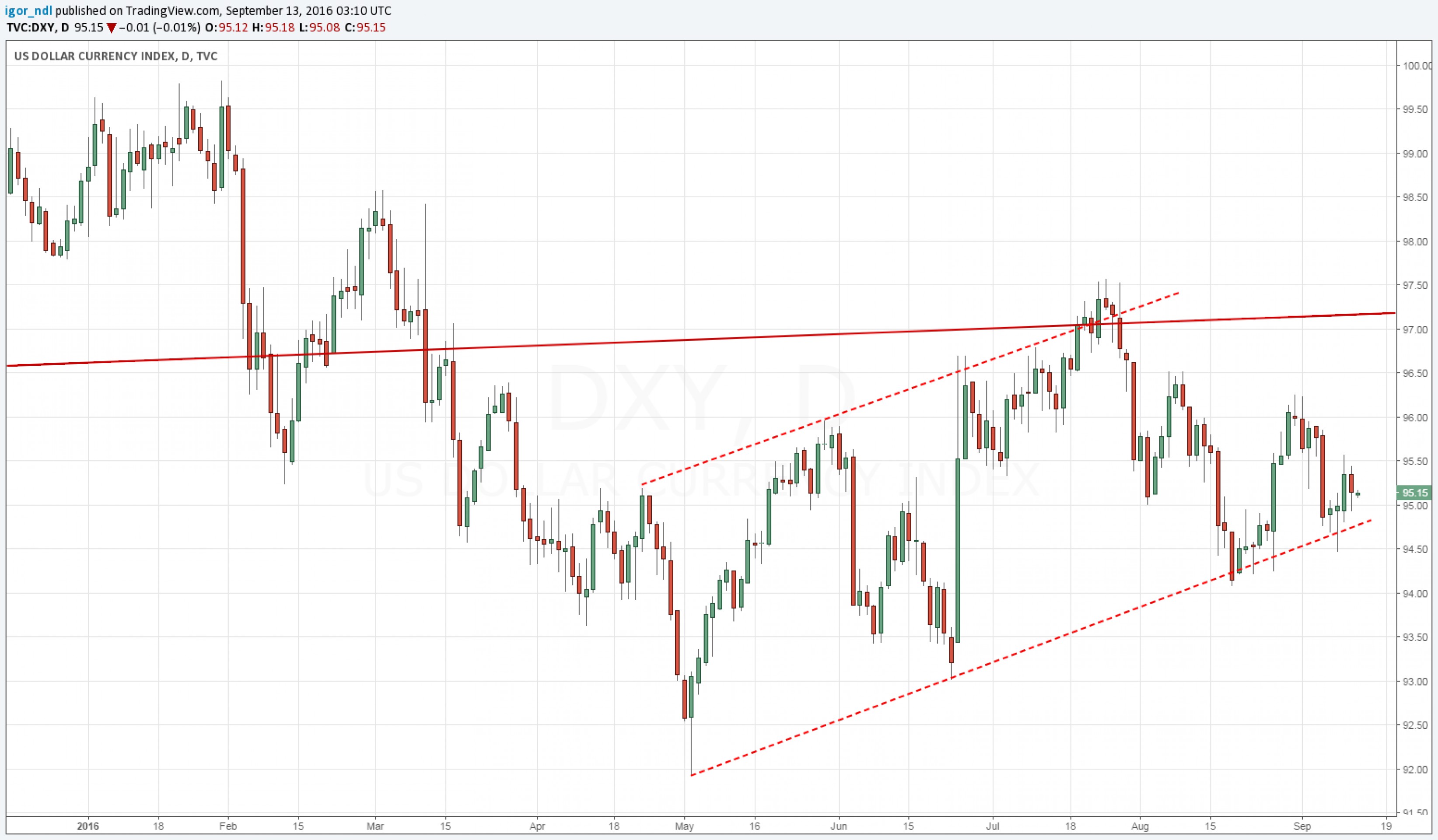 С технической точки зрения до сих пор возможны два варианта: поход к верхней границе канала либо пробой нижней и выход вниз. В теории, если ФРС ничего не будет менять, индекс доллара может ускорить падение и реализовать второй сценарий, но есть один важный момент: Федрезерв может снова дать какие-нибудь намеки на ужесточение денежно-кредитной политики, на что рынок может отреагировать ростом американской валюты.