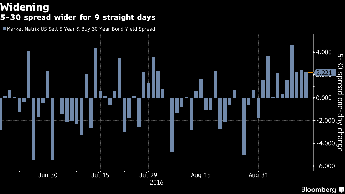 Доходность эталонных американских десятилеток демонстрировала незначительные изменения на уровне 1.71% по состоянию на 6:51 в Лондоне в четверг на основе данных, собранных Bloomberg. Стоимость 1.5% бумаг со сроком истечения в августе 2026 года была на уровне 98 3/32. Спред между доходностью пятилетних и тридцатилетних бумаг отскакивает после снижения в августе до наиболее узкого показателя с первого квартала 2015 года. Он составлял 124 базисных пункта со 102 в прошлом месяце. Последний раз, когда кривая доходности росла так быстро, был в 2012 году, когда первичные дилеры отгружали ФРС 30-летние облигации на миллиарды долларов в рамках программы закупок активов.