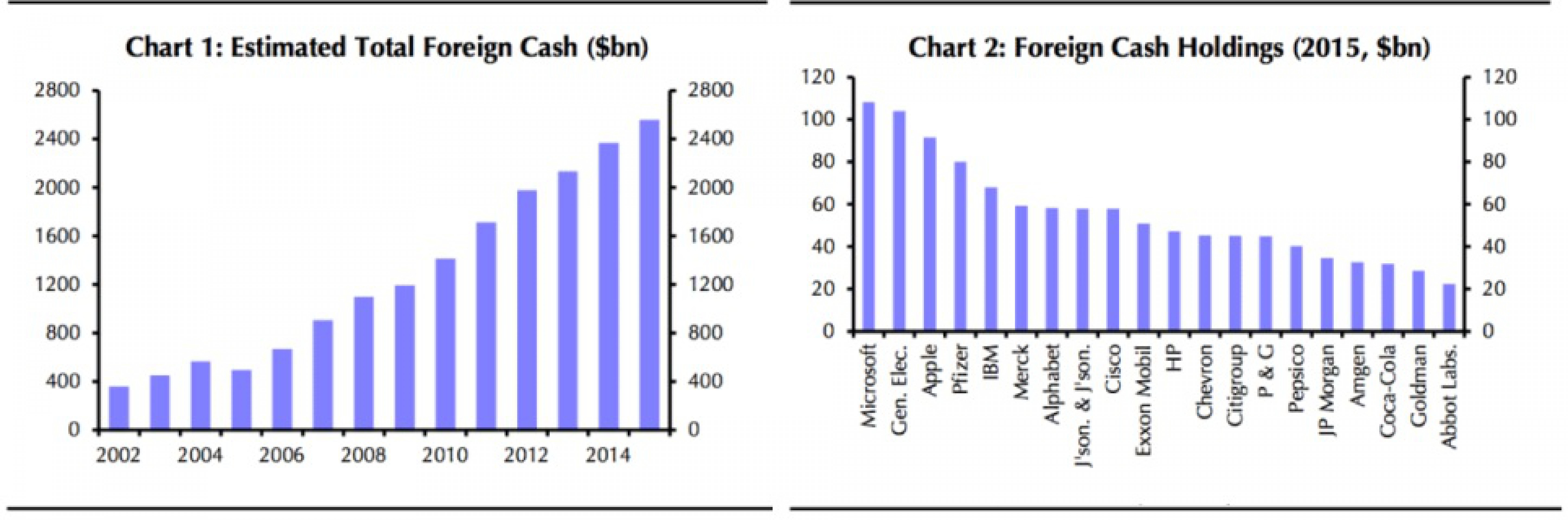 "Все более крупные суммы наличных средств в иностранной юрисдикции удерживаются группой больших компаний. В настоящий момент Apple на постоянной основе реинвестирует за пределами США $91,5 млрд от своих прибылей, данная корпорация не является лидером по хранению средств за пределами США. General Electric и Microsoft удерживают эквивалентные наличным средства в размере более $100 млрд.