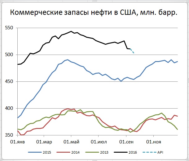 А вот цены американской нефти за прошедшие сутки заметно выросли. Благоприятным фоном для этого были оценки Американского института нефти (API) о новом сокращении (на этот раз на 7,5 млн. бар.) запасов в США. Если это так, то будет третья неделя сокращения, за которые запасы похудеют на 22 млн. баррелей. В качестве причин называют погодные условия, тормозящие поставки, а также контригру против готовящихся переговоров в Алжире о заморозке добычи (цены и так подрастают – зачем же нужна заморозка).