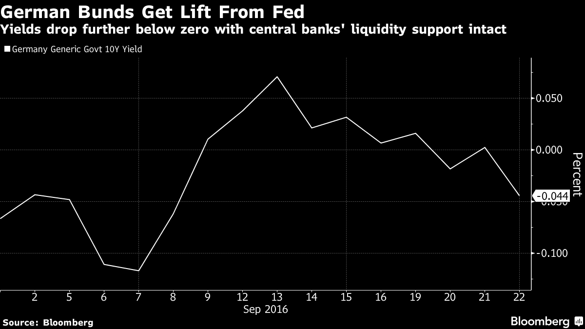 Доходность немецких десятилеток снизилась на 5 базисных пунктов или 0.05% до -0.044% по состоянию на 8:11 по Лондону, коснувшись -0.047% - минимума с 9 сентября. Тридцатилетние бумаги снизились на 6 базисных пунктов до 0.53%, тогда как двухлетние ценные бумаги демонстрировали незначительные изменения в динамике на уровне -0.66%. Таким образом, спред доходности между этими ценными бумагами составил 119 базисных пунктов. Чиновники ФРС дали понять, что повышение процентных ставок позже в этом году еще вероятно, хотя снизили прогнозы на 2017 год и далее. В Японии более долгосрочные ценные бумаги демонстрировали хорошие показатели в среду после того, как ЦБ сместил центр внимания монетарных стимулов на контроль за кривой доходности. Доходность испанских десятилеток снизилась на 6 базисных пунктов до 0.94%, тогда как итальянский долг с аналогичным сроком погашения снизился также на 6 базисных пунктов до 1.22%.