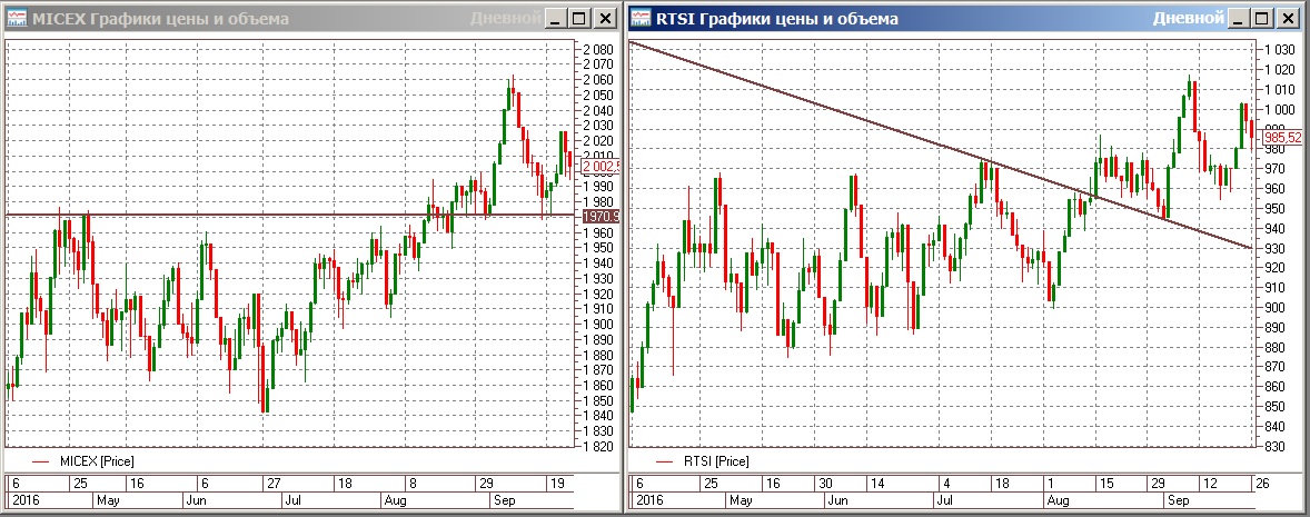 Индексы ММВБ и РТС после недавнего прорыва вверх выше сильных уровней сопротивления пока не могут развить свой успех и бьются в окрестностях 2000 пунктов для ММВБ и 1000 пунктов для индекса РТС. В конце прошлой недели индексы снижались. Снижением открывается и текущая неделя. Пробитые недавно вверх бывшие уровни сопротивления стали локальными уровнями поддержки. Вблизи них и будут происходить главные сражения быков и медведей на текущей неделе. Дальнейшее поведение нашего рынка будет зависеть от результатов встречи нефтепроизводителей в Алжире.