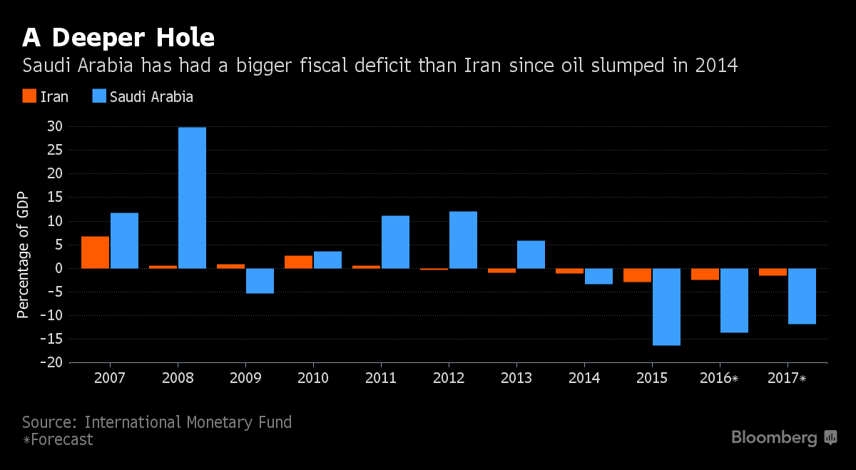 По оценкам МВФ, Саудовская Аравия придет к дефициту бюджета в эквиваленте 13.5% от ВВП в этом году в сравнении с менее чем 2.5% от ВВП для Ирана. В МВФ заявляют, что саудиты нуждаются в нефти по стоимости близкой к $67 за баррель, чтобы закрыть свои дыры. Для Ирана же эта цена может быть ниже $61.50. Сырая нефть марки Brent снизилась на 0.4% до $47.18 за баррель по состоянию на 13:18 в Гонконге. Когда речь заходит об экономическом росте, Саудовская Аравия демонстрирует резкое замедление до 1%, тогда как Иран ускоряется в сторону 4%. Сальдо счета текущих операций, выступающее широким индикатором текущих экономических отношений в мире, демонстрирует такую же разнонаправленность. Саудовская Аравия сталкивается с двухзначным дефицитом в этом году, Иран практически пришел к балансу после экономических реформ 2012 и 2013 годов из-за необходимости пережить влияние международных санкций из-за ядерной программы.