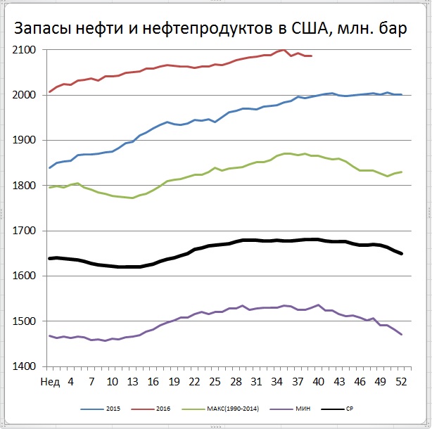 Согласно оценкам среднедневные объемы добычи за неделю, закончившуюся 23 сентября, снизились на 15 тыс. баррелей в сутки (до 8,497 с 8,512 mb/d неделей ранее). На Аляске минус 10 и в остальных штатах -5 тыс. бар. в сутки. Тренд на снижение добычи пока еще продолжает бороться за свое продолжение, но от минимальных отметок добыча на текущий момент выше на 69 тыс. баррелей. (Правда, от максимумов лета 2015 года добыча сейчас меньше на 1,113 mb/d или на 11,6%).