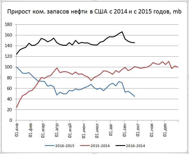 Из такого графика может сложиться ощущение, что всего пустых бочек под нефть и прочие бензины у США было 2100 млн. баррелей. Хотя это вряд ли. Аналогичные размышления могут возникнуть из рассмотрения графика приращения коммерческих запасов нефти за прошедшие два, которое упорно колеблется около дополнительных 150 мега бочек (разность между кривыми на рис. 1):