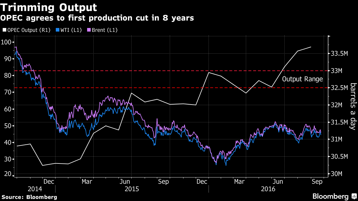 Нефть колебалась около $45 за баррель перед встречей в Алжире, так как трейдеры спекулировали на тему того, что ОПЕК может лишь обсудить условия стабилизации рынка. Саудовская Аравия и Иран сигнализировали перед встречей о том, что соглашение в Алжире крайне маловероятно, тогда как все, кроме 2 из 23 опрошенных аналитиков, прогнозировали невозможность заключения сделки. ОПЕК заявит о конкретных ограничениях по добыче на официальном заседании в ноябре, тогда как Ирану ничего сокращать не придется.