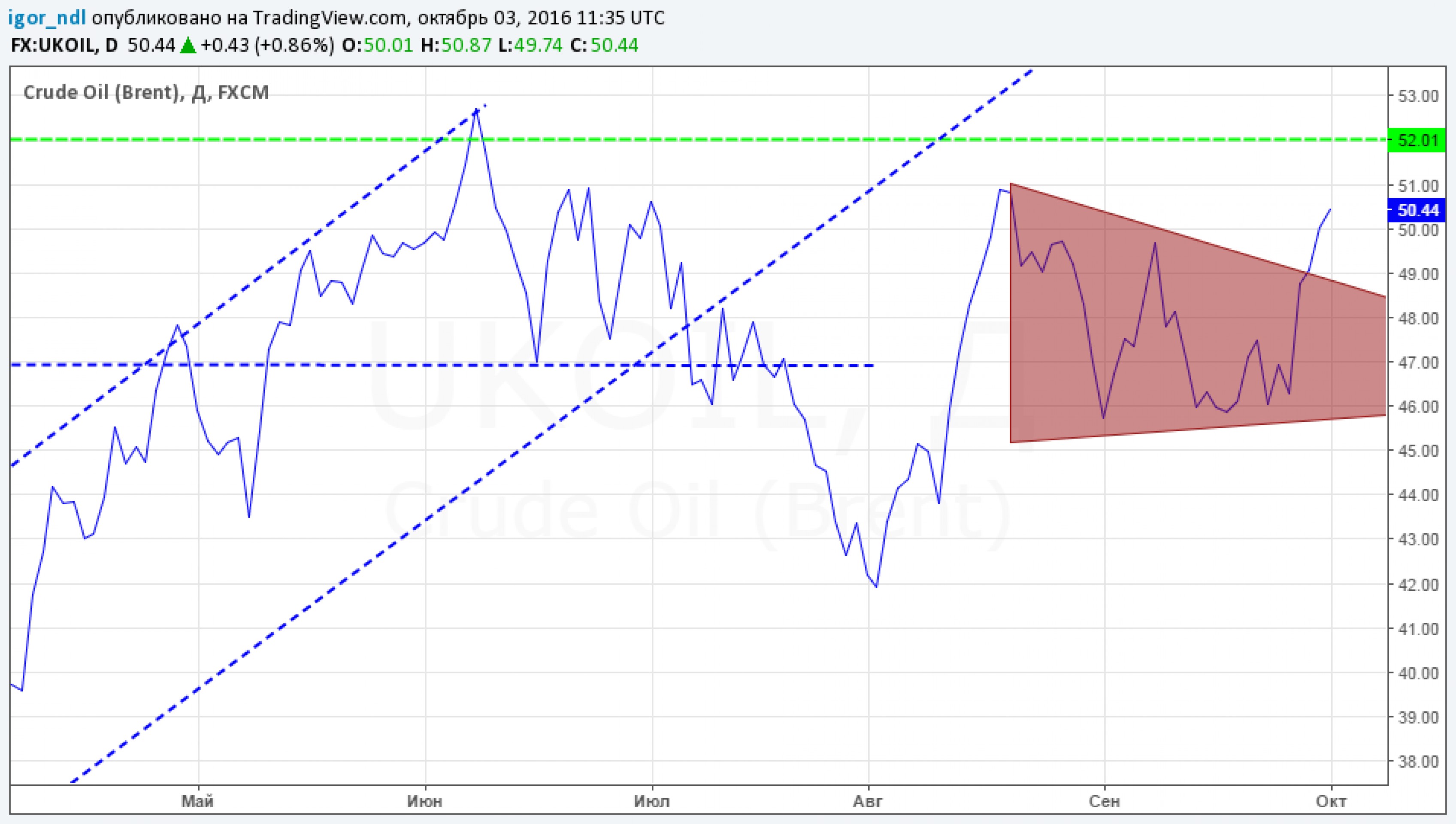 Укрепление национальной валюты происходит на фоне дорожающей нефти. Сегодня баррель смеси Brent вырос почти на процент и стоит по состоянию на 14:35 по московскому времени $50,44. Особых драйверов для роста нефти сегодня нет, однако есть технические факторы. Мы уже писали, что пробой верхней границы треугольника открывает дорогу к новым высотам. Так, собственно, и вышло.