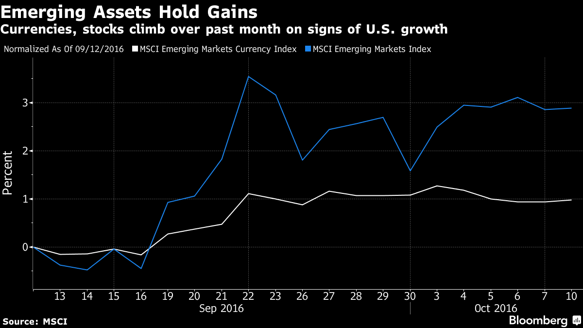На фоне улучшения перспектив, поддержавших азиатские активы, рост вероятности ужесточения политики ФРС сдержал спрос на азиатские активы. Вероятность повышения ставок в декабре выросла до 64% в пятницу с 61% в начале прошлой недели. Вона выросла на 0.4% по состоянию на 12:28 в Сингапуре в понедельник, тогда как ринггит вырос на 0.2%, прервав трехдневный рост. Мексиканский песо компенсировал рост, сохранив при этом наиболее существенный рост за день после дебатов. Индекс MSCI развивающихся рынков вырос почти на 0.2% после роста на 1.3% на прошлой неделе. Семь из 11 секторов в индексе росли. Акции Samsung Electronics Co. снизились на 3.2%. Компания временно приостановила производство смартфонов Note 7 после жалоб клиентов на проблемы с безопасностью устройств.