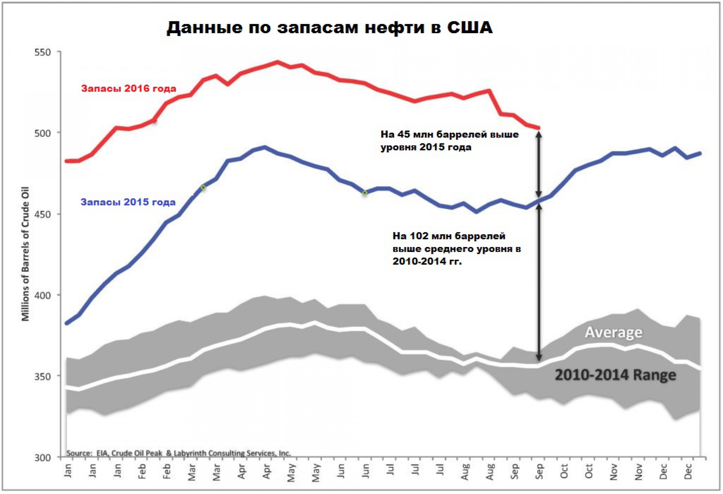 Текущие показатели запасов на 45 млн баррелей выше показателей 2015 г., которые были на более чем на 100 млн баррелей выше средних показателей в период с 2010 по 2014 гг.