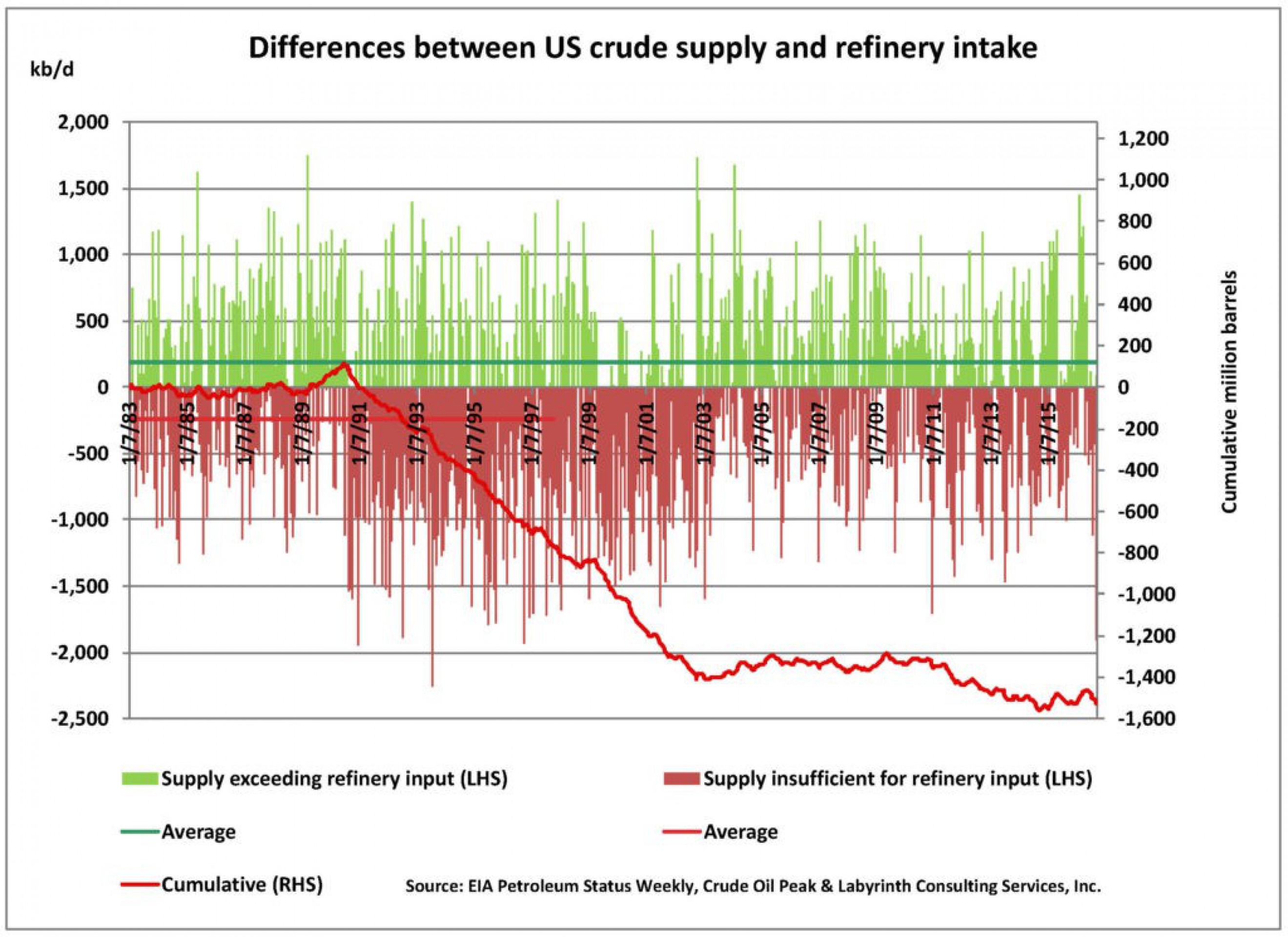 Если говорить о более близком историческом периоде, то дополнительный дефицит в объеме почти 200 млн баррелей образовался, когда объемы, направляемые на НПЗ, превысили поставки сырой нефти в период с 2010 по 2014 гг.