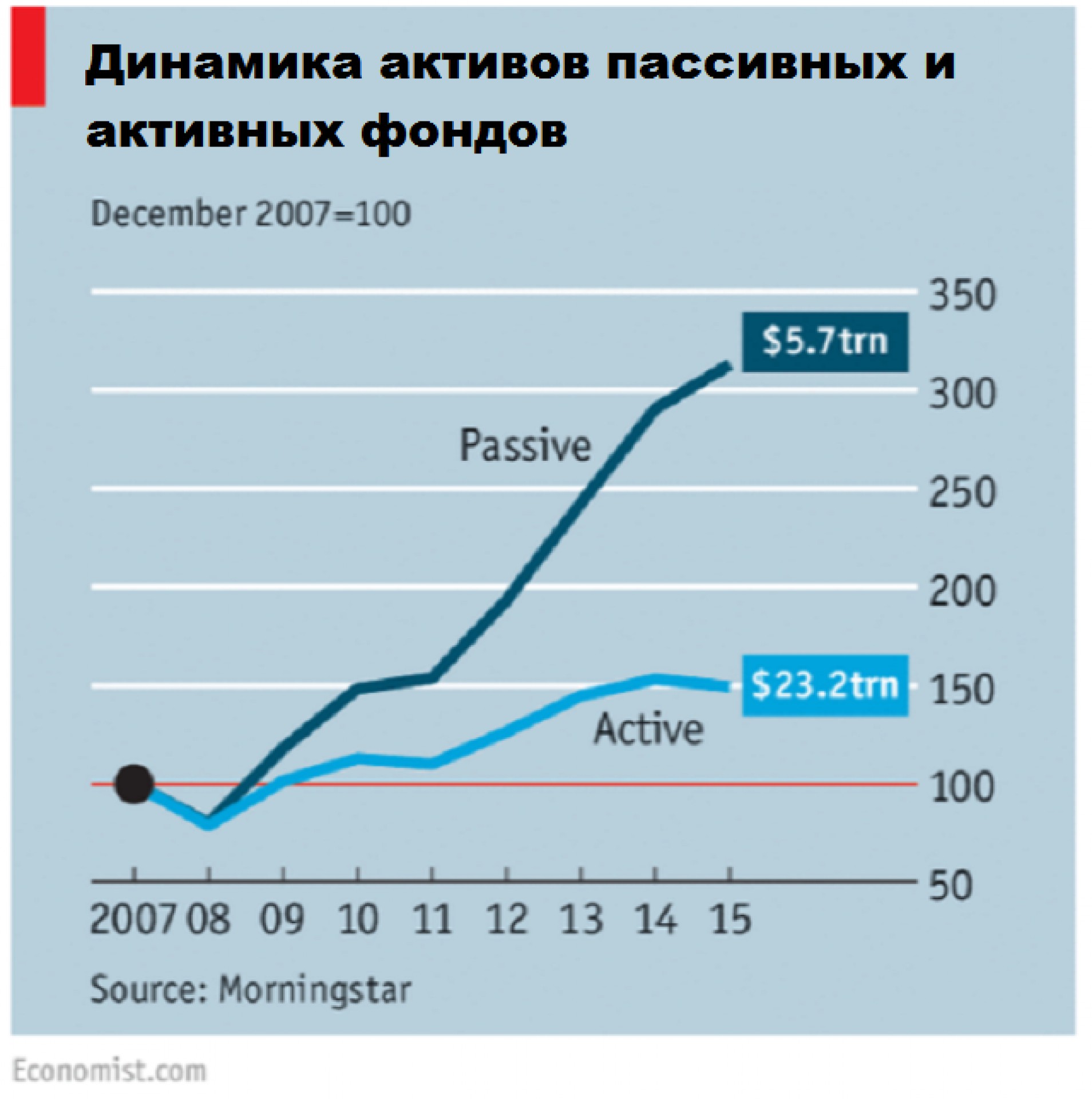 Согласно данным Morningstar с декабря 2007 г. активы пассивных фондов увеличились в три раза, достигнув $5,7 трлн, в то время как у активных фондов они уменьшились на 54% до $23,2 трлн.