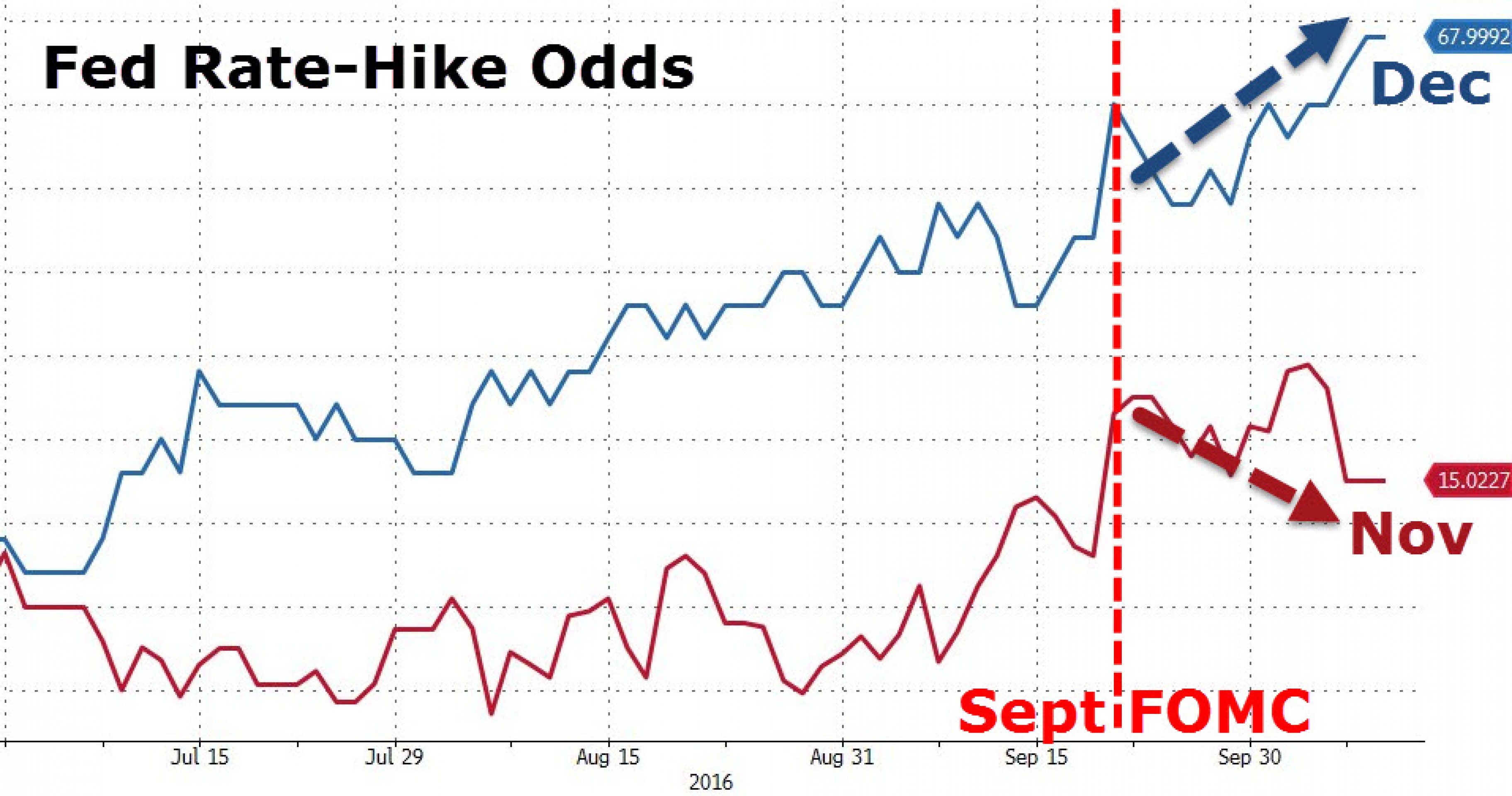 Вероятность повышения ставки в декабре рынок теперь оценивает почти в 70%, и это максимум за последнее время.