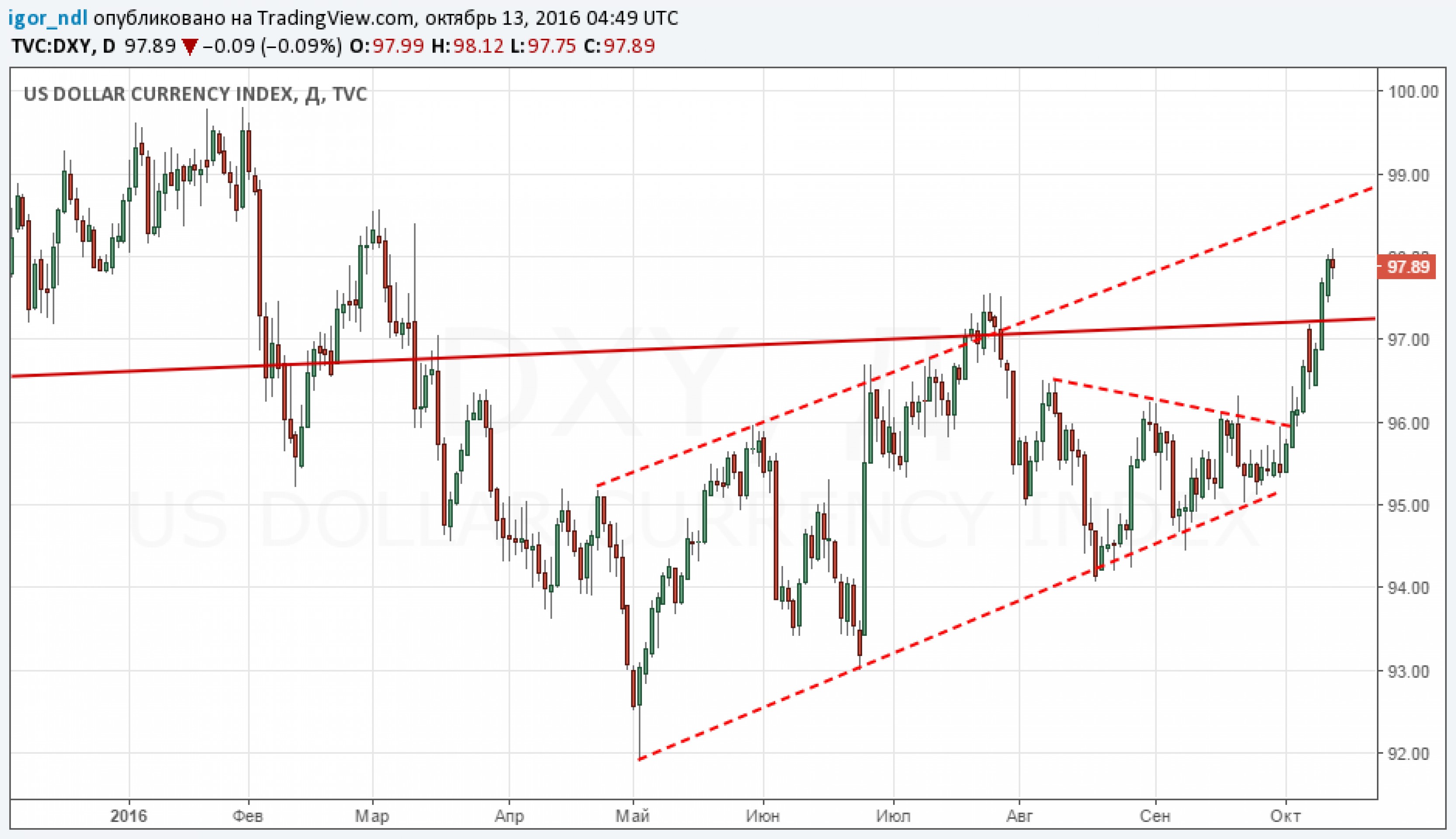 Индекс доллара к корзине шести основных валют растет уже почти десять сессий без перерыва. Накануне мы увидели очередной виток роста, которому способствовала публикация протокола последнего заседания Федрезерва.
