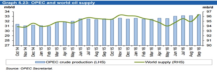 В ожидании свежих данных от EIA, полезно посмотреть на обновленные вчера данные из сентябрьского обзора ОПЕК. Несмотря на трудности многих экономик, мировой спрос на нефть продолжает ежегодно подрастать чуть более процента в год. (в 2016 ожидается еще +1,24 mb/d).