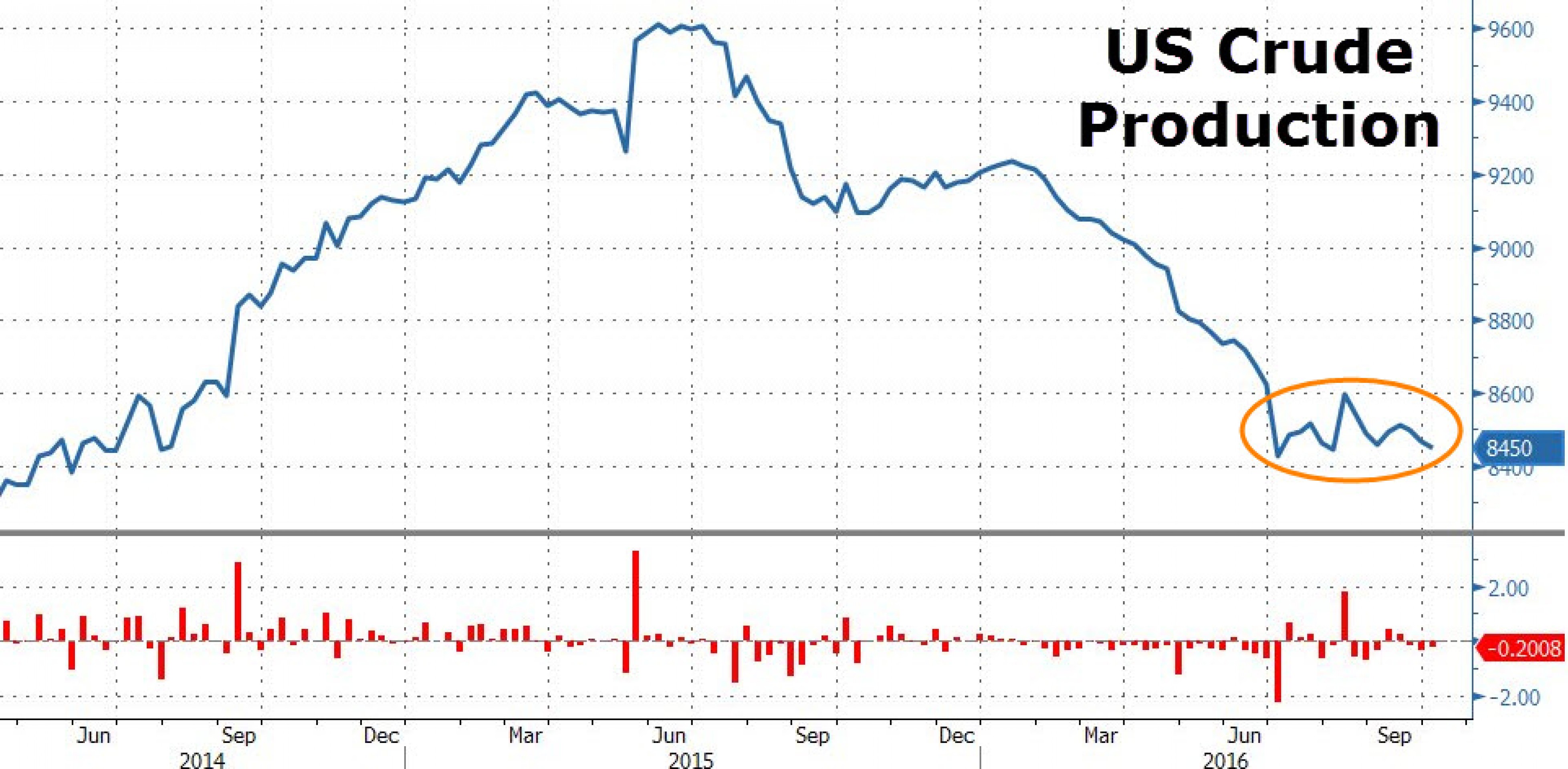 А вот добыча по-прежнему не растет. За отчетную неделю она сократилась на 17 тыс. баррелей. В целом стоит отметить, что объем добычи стабилизировался в районе 8,5 млн баррелей в сутки и особых колебаний в последнее время не показывает.
