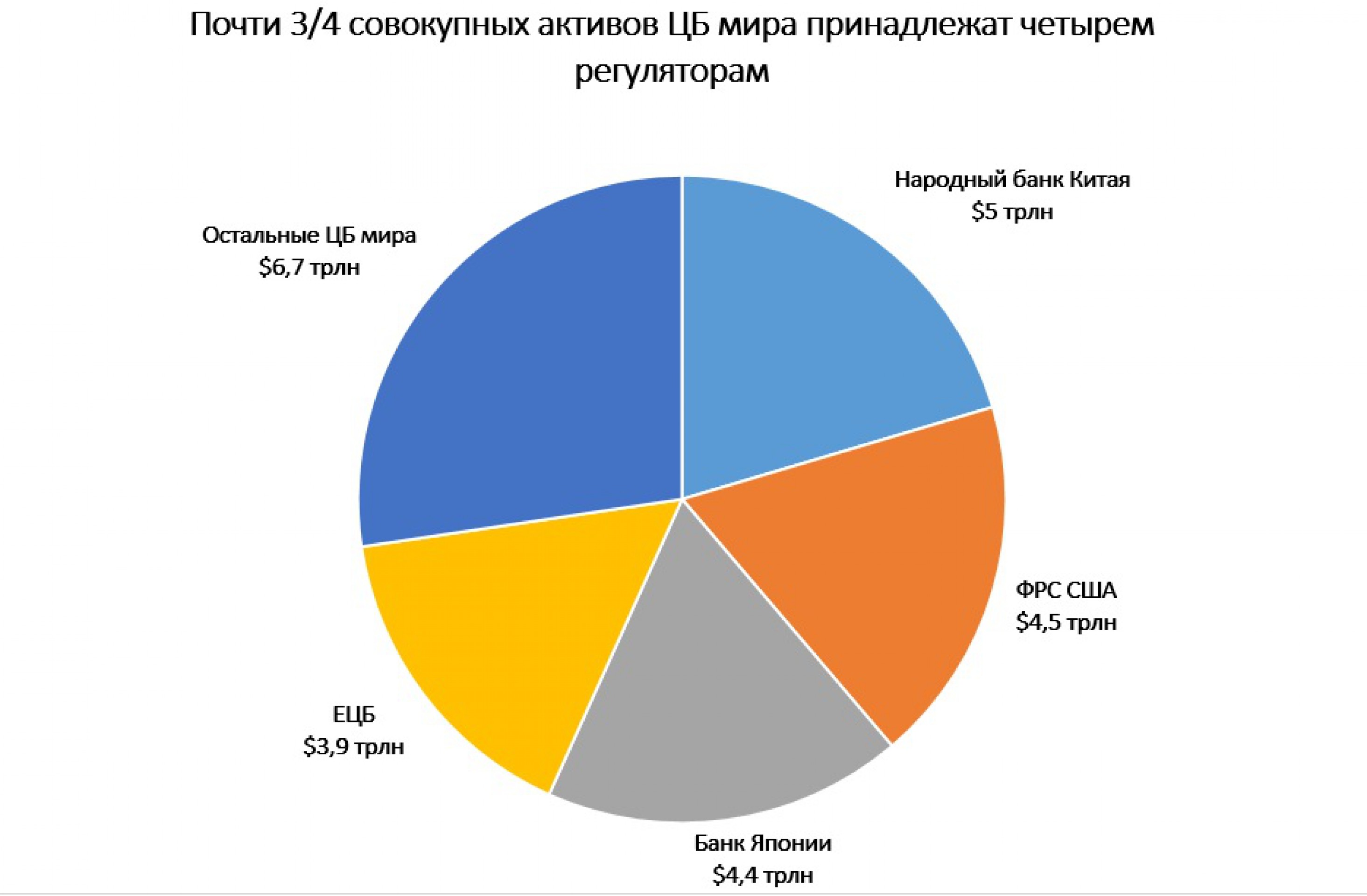 Почти 75% активов ЦБ мира находятся под контролем политиков в Китае, США, Японии и еврозоне. На остальные шесть регуляторов из топ-10 - центральные банки Бразилии, Швейцарии, Саудовской Аравии, Великобритании, Индии и России - приходится в среднем по 2,5%. Оставшиеся 107 центральных банков, которые отслеживает Bloomberg, в основном основываясь на данных МВФ, контролируют менее 13% активов.