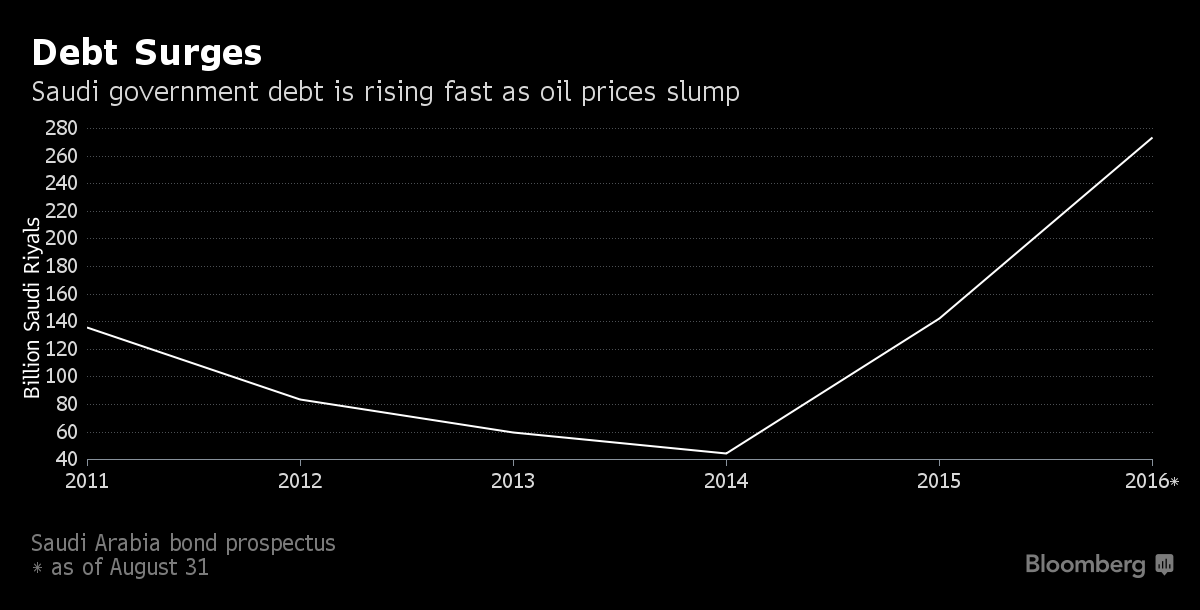 Продажа облигаций станет поворотным моментом для Саудовской Аравии. Королевство вернулось на землю вместе с обвалом цен на нефть, сделавшим ее экономику неустойчивой. В то время как инвесторы впервые получили возможность доступа к стране, появляются также вопросы, насколько плохо могут пойти дела. Крупнейший в мире экспортер нефти хочет получить, по крайней мере, $10 млрд. от продажи облигаций со сроком погашения в 5, 10 и 30 лет на этой неделе. Их выход на долговой рынок в принципе указывает на тяжесть складывающейся ситуации. Дефицит бюджета раздулся до максимального уровня почти за 20 лет, и правительство принялось тратить валютные резервы, и также было вынуждено продавать локальные облигации, чтобы выручить в итоге $63 млрд. Государство сокращает расходы и зарплаты в рамках предложенных вице-кронпринцом Салманом мер, включая запланированное публичное размещение нефтяного гиганта Saudi Aramco.