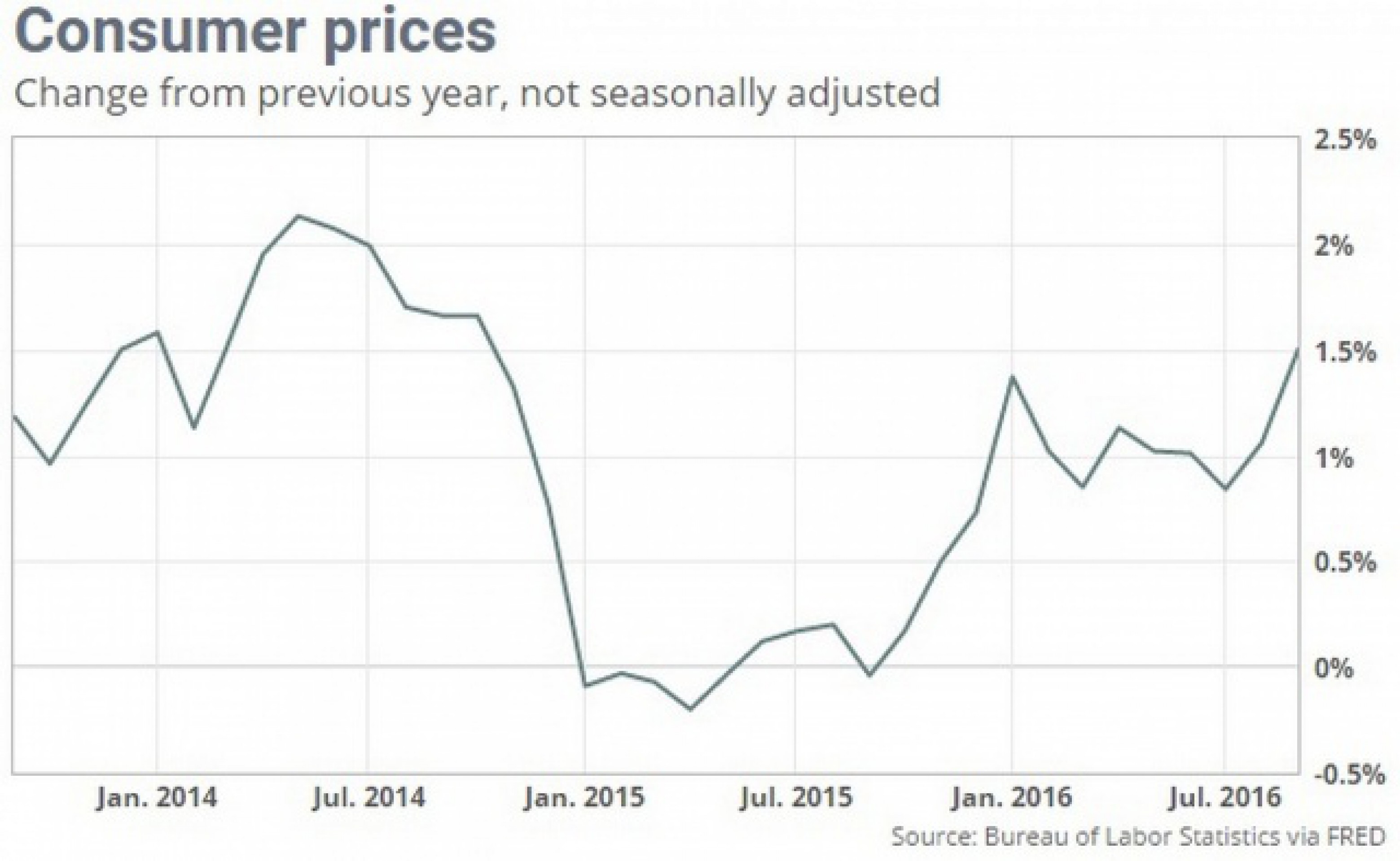 Самое время взглянуть на свежие макроэкономические данные. Инфляция в США поднялась до максимума с октября 2014 г. Потребительские цены (индекс CPI) в сентябре 2016 г. выросли на 1,5% в годовом выражении, что стало максимальным повышением с октября 2014 г., свидетельствуют данные министерства труда страны.