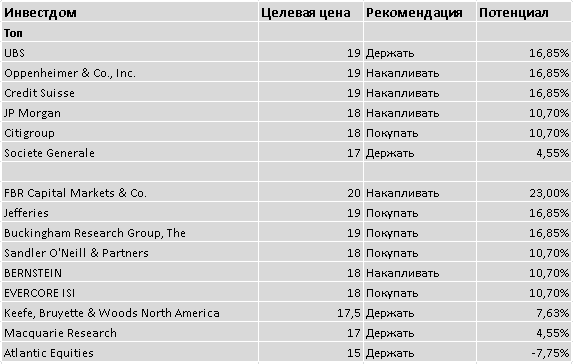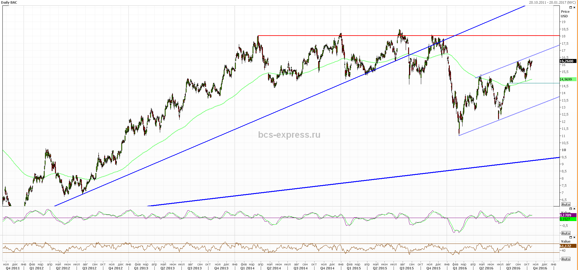 Улучшение ситуации на рынке нефти в последние полгода играет в пользу кредитного портфеля BAC, так как финансовое положение нефтедобывающих компаний пошло на поправку. Кредитный портфель банковской группы имеет высокую чувствительность к изменению рыночных доходностей, и в перспективе банк может стать одним из главных бенефициаров потенциального ужесточения монетарной политики в США. Также, в случае улучшения ситуации в американской экономики спрос на кредиты может возрасти. Согласно оценкам Reuters, на ближайшие 12 месяцев речь может идти о 21,5% росте прибыли на одну акцию.