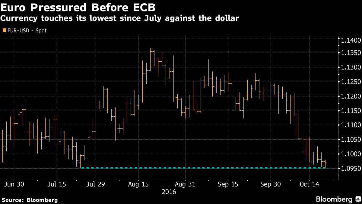 “Пресс-конференция Драги будет достаточно важна, - заявил Петр Крпата, валютный стратег ING Groep NV в Лондоне. - Он может повлиять на снижение вероятности сворачивания закупок, а также намекнуть на потенциальное продление программы количественного смягчения, что может достаточно негативно сказаться на евро, хотя пространство для снижения может быть сильно ограничено”. Евро демонстрировал незначительные изменения в динамике на уровне $1.0973 по состоянию на 8:47 по Лондону, ранее снижаясь до $1.0952 - минимального уровня с 25 июля. Валюта потеряла на 2.3% в этом месяце против доллара.