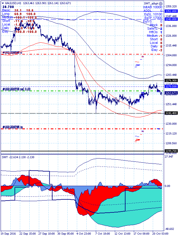 Торговая тактика адаптивного торгового робота. Активными фильтрами на момент распечатки графиков являются фильтр среднесрочного тренда и фильтр внутридневного тренда (цифровой индикатор в правом верхнем углу графика), в соответствии с показаниями которых робот возобновил продажи золота с промежуточной целью в зоне 1220. При продолжении нисходящего движения включится фильтр локального тренда, который в рамках режима агрессивной торговли даст роботу возможность удвоить количество позиций в рынке и удвоить объем по вновь открываемым позициям.