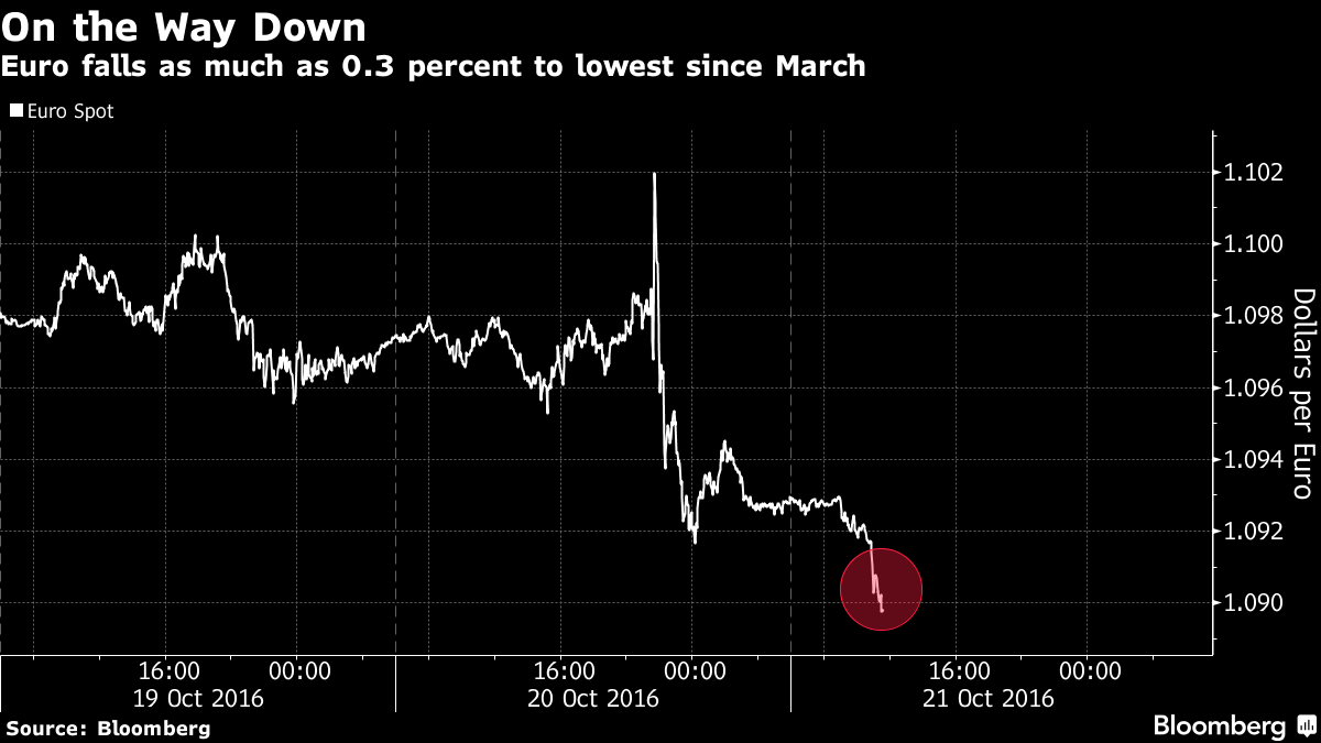 Евро снизился на 0.2% до $1.0909 по состоянию на 7:19 в Лондоне после снижения почти до $1.0896 - минимума с 10 марта. Валюта потеряла 0.6% на этой неделе. Симсон прогнозирует, что она устремится к $1.0830. Беспрецедентный план QE был придуман для того, чтобы придать импульс инфляции и экономическому росту. Стимулирующая денежно-кредитная политика была направлена на снижение валюты, что должно было потенциально принести выгоду экономике за счет удешевления экспорта и роста потребительских цен. Драги заявил в четверг о том, что внезапный конец QE маловероятен. ЕЦБ сохранил процентные ставки и план программы закупок активов неизменными, что и прогнозировалось экономистами в исследовании Bloomberg. Индекс доллара Bloomberg, отслеживающий позиции валюты против 10 основных, подрос на 0.1%. Трейдеры фьючерсами закладывают вероятность повышения ставок около 68% к декабрю с 66% в конце прошлой недели.