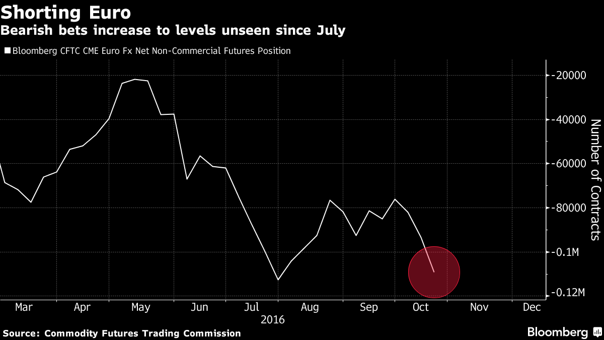 Индекс доллара Bloomberg демонстрировал нерешительную динамику перед выступлениями Джерома Пауэлла и региональных президентов ФРС Нью-Йорка, Сент-Луиса и Чикаго. Вероятность повышения ставки в этом году выросла на 2 процентных пункта на прошлой неделе до 68%. Евро снижался пятый день подряд, что стало наиболее длинной чередой снижения за 5 месяцев после того, как ЕЦБ сигнализировал о том, что программа количественного смягчения, вероятно, продлится и после марта 2017 года. Спекулянты увеличили количество медвежьих ставок на евро до максимального значения с июля.