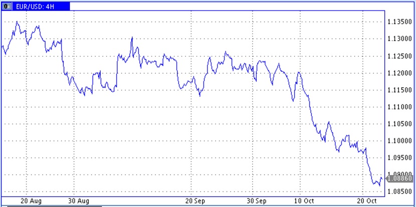 Прошедшее на прошлой неделе заседание ЕЦБ не принесло ясности по поводу судьбы программы выкупа облигаций, которая заканчивается весной 2017 года. На сопроводительной пресс-конференции Драги отказался предоставить любую информацию о будущем программы QE, аргументируя это тем, что данный вопрос не обсуждался на заседании ЕЦБ. Есть вероятность, что из-за необходимости поддержки проблемных стран Еврозоны, а так же из-за растущих проблем банковской системы все-таки придется принимать решение о продлении программы QE после марта 2017 года. Но пока отсутствие намеков на некоторое сворачивание программ выкупа от Марио Драги привело к новому витку ослабления евро. И если большинство валютных пар пребывают в относительно спокойном состоянии, то евро после заседания ЕЦБ пошло на новую волну снижения. А всего с начала октября потери евро к доллару составляют уже более 4%. Слабость евро стала важным вкладом в дальнейшее укрепление индекса доллара. А на фоне укрепляющегося доллара подорожание многих активов стало проблематичным.