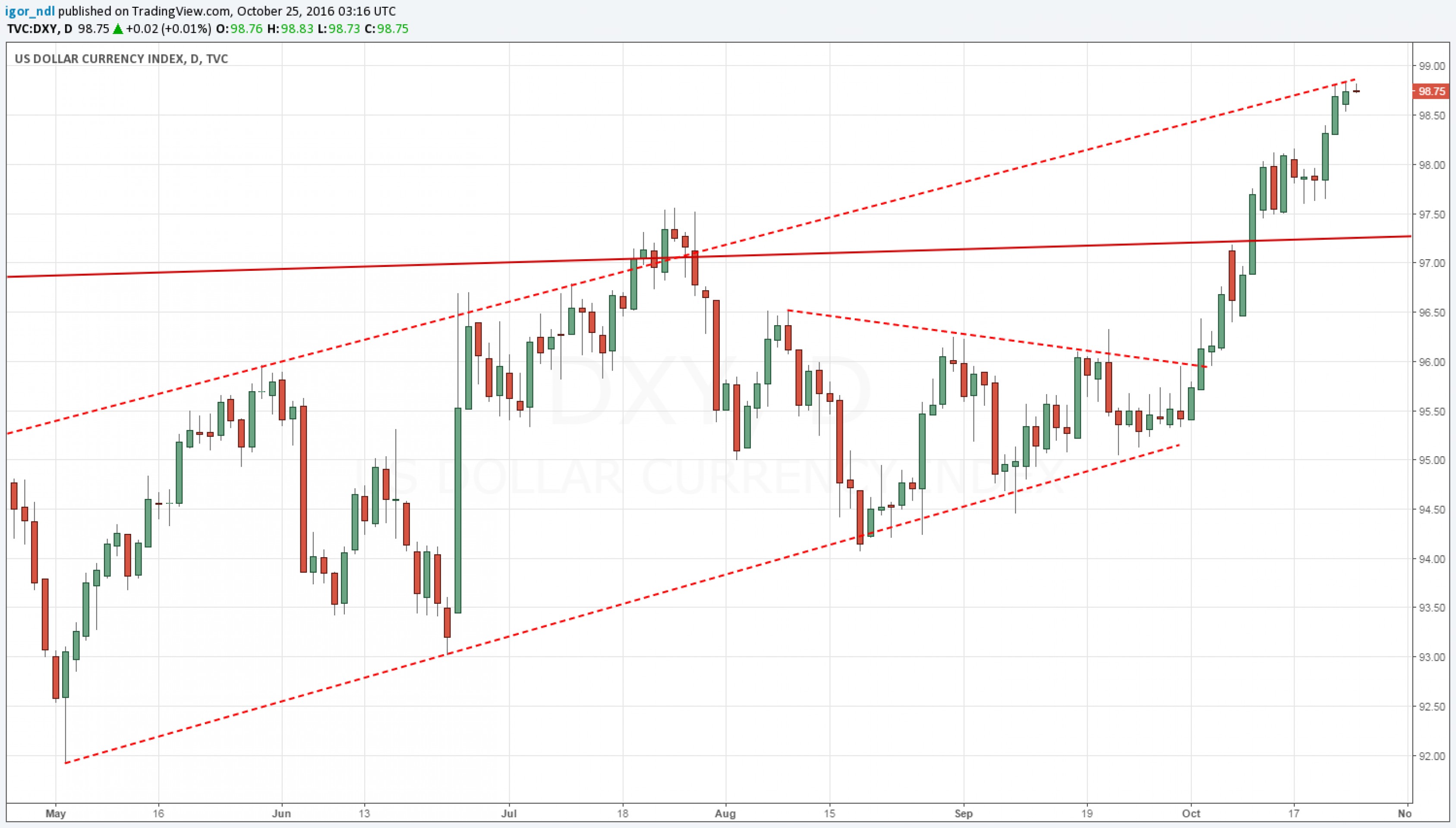 Теперь самое время посмотреть на индекс доллара к корзине основных валют. С технической точки зрения здесь сейчас наступает ключевой момент. Котировка индикатора вплотную приблизилась к верхней границе диапазона. Вообще, такие графики почти никогда не получают продолжения роста, но все равно нужно понаблюдать за развитием событий.
