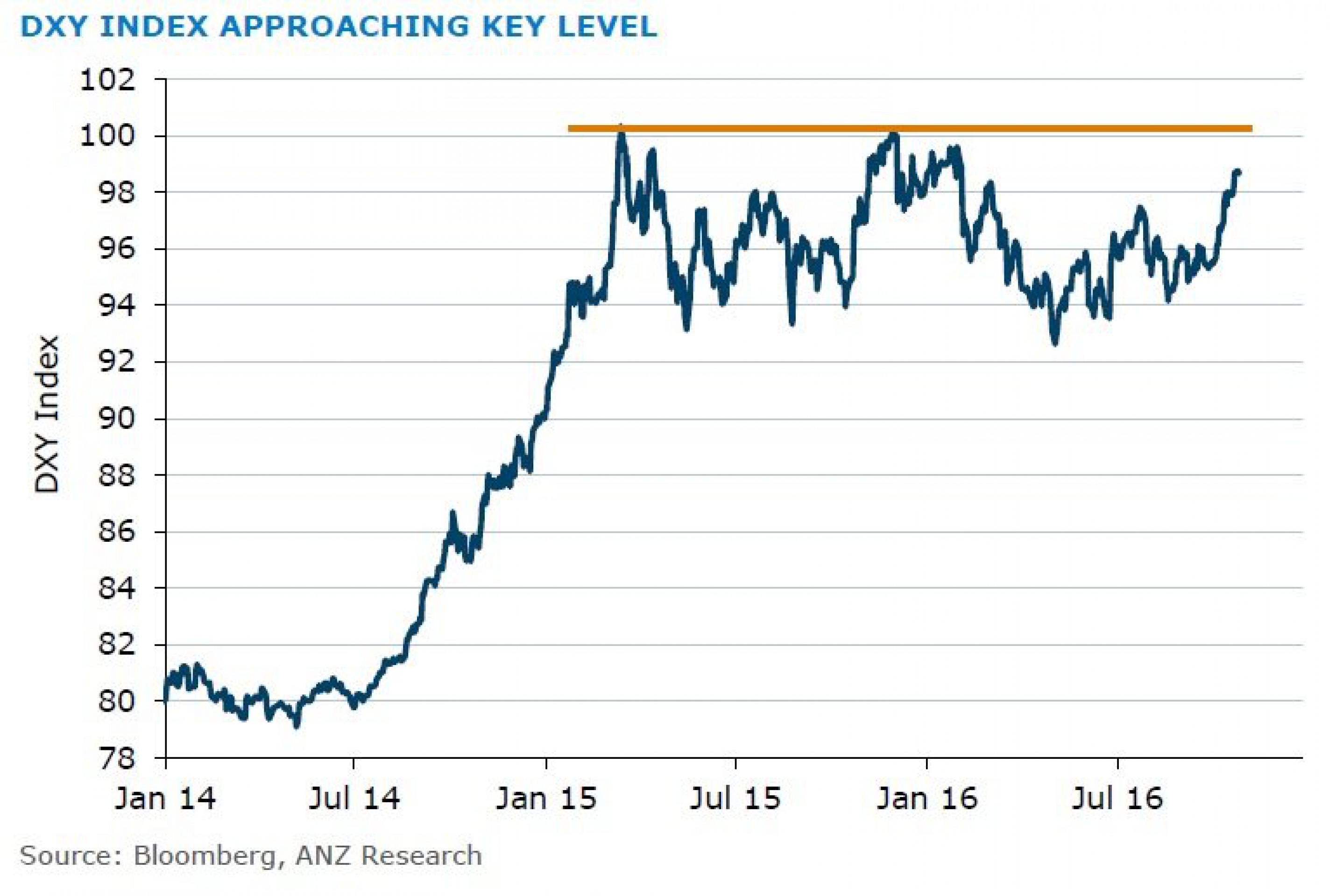 Технические аналитики ANZ отмечают, что уровень 100 пунктов является ключевым техническим уровнем сопротивления, который американская валюта с 2015 г. преодолела только дважды, но вслед за этим сразу следовало падения.