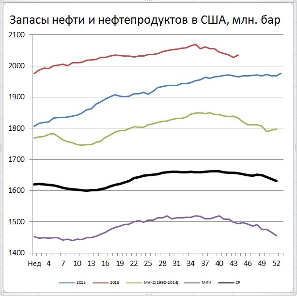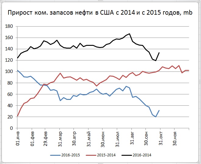 Можно сказать, что тренд на снижение запасов в прошедшую неделю получил смертельную рану. Во всяком случае, угроза пересечения кривых запасов за 2015 и 2016 год стала временно неактуальной. А кривая разности объемов запасов (за 2016 — за 2015) "как ошпаренная" отскочила от прироста в 20 mb.