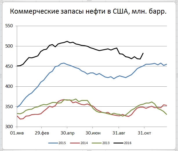 EIA опубликовало последние данные по запасам и добыче нефти. За неделю, закончившуюся 28 октября 2016 года, коммерческие запасы нефти в США выросли на 14,4 млн. баррелей (до 482,578 с 468,158 млн. баррелей неделей ранее). По вышедшим накануне данным API запасы нефти на неделе 22-28 октября выросли на 9,3 млн. баррелей. Опрошенные агентством Рейтер аналитики прогнозировали рост на 1,013 миллиона баррелей. EIA в очередной раз посрамила выходившие накануне данные API, и, тем более, прогнозы аналитиков.