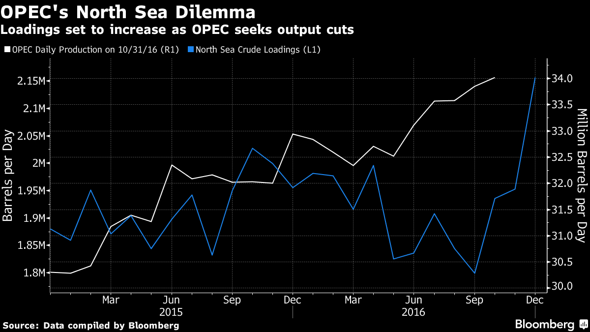 Поставки из Северного Моря вырастут на 10% по сравнению с прошлым месяцем до объемов около 2.16 млн. баррелей в день в декабре, по данным, собранным Bloomberg. Если весь запланированный объем поставок действительно будет отгружен, то это доведет региональный объем до максимального уровня с мая 2012 года. Рост только с сентября, когда проводилось обслуживание оборудования, может составить почти 360k баррелей в день. Стоимость Brent продолжила снижаться шестой день подряд. Марка потеряла 7 центов до $46.28 за баррель по состоянию на 8:41 в Лондоне. В то время как поставки некоторых членов ОПЕК действительно снижаются, не входящие в картель страны лишь наращивают добычу, включая Казахстан, Бразилию и Россию, которая в прошлом месяце довела добычу до максимального уровня со времен СССР. К тому же, США теперь свободно экспортируют свою нефть по всему миру после снятия запрета в прошлом году.